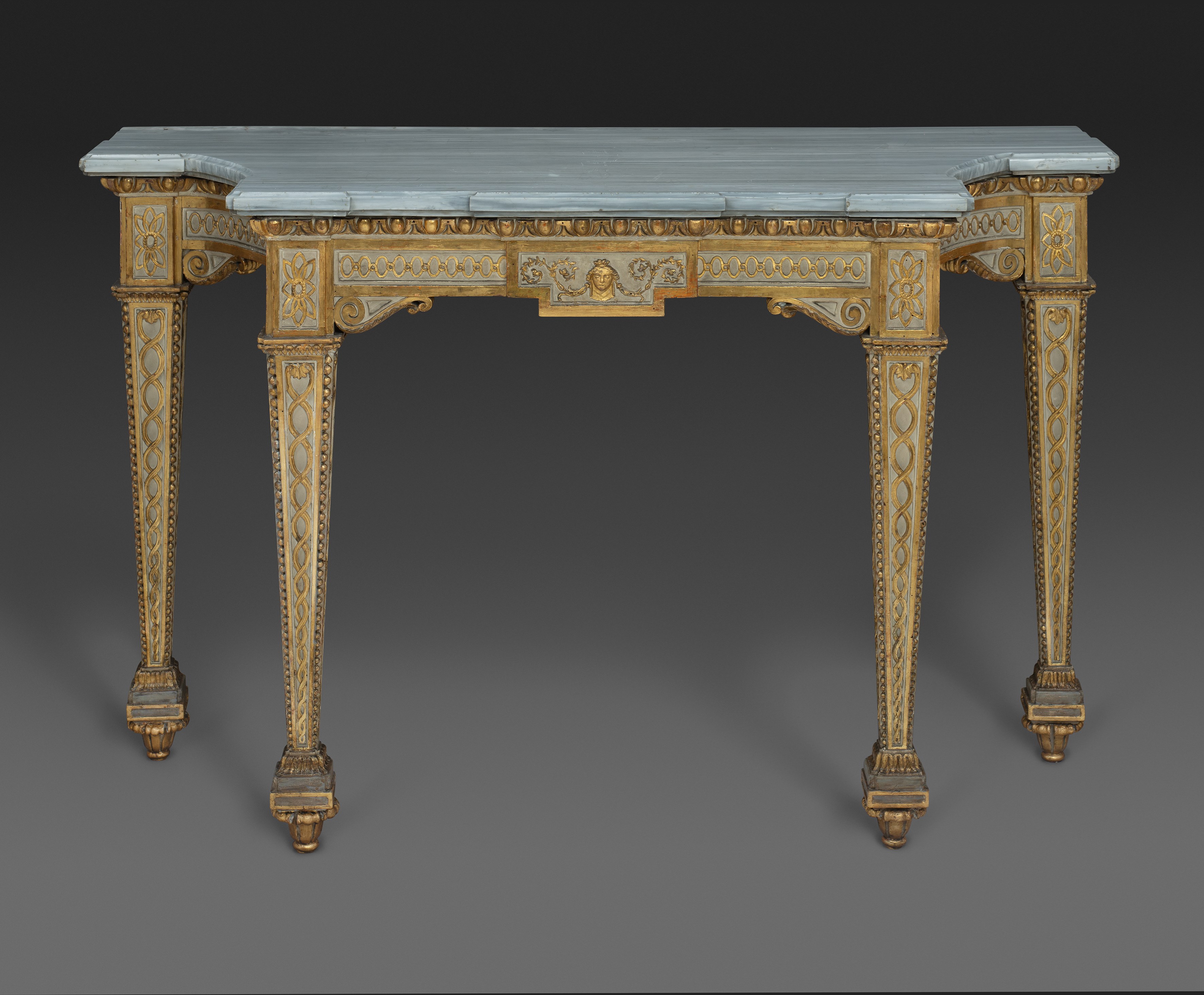 The rectangular top with rounded corners with a central oval reserve bearing a complex trophy symbolising the triumph of love comprising a crossed quiver and flaming torch with Cupid’s bow on a laurel branch and two doves in ivory, one clasping a bunch of grapes, the trophy on an amaranth ground within a pear-wood reserve with kingwood spandrels and cross-banding in various woods, the front and back of the piece ornamented with similar trophies within reserves with greek-key panels above and below, the sides decorated with oval foliate rosettes, the front with a slide above two drawers sans traverse fitted for a collection of veneer samples, the right hand side with a frieze drawer with ink and sander compartment, the rounded corners decorated with garlanded flambeaux, on turned tapering legs, the fluting simulated in scorched sycamore veneers with ormolu ring-capitals and toupie feet with casters.