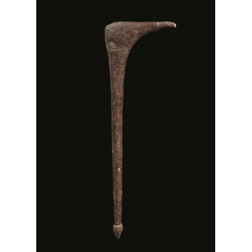 The Aibom (from the name of the village) do not harvest sago : they obtain it by trade with other neighboring groups. As a result, there is a constant need to store the sago and these magnificent jars are made for that purpose. There are two types of jars The small model is called NORANGGAU : it is short, squat, and rather inelegant and is used to store the fresh sago before it is either smoked or cooked. The large model, called DNMRAU (the present example), is used for the long-term storage of smoked sago. The face is placed to one side of the long neck on the large type of jar, while on the small one there are two to four faces placed around the upper third of the pot These faces represent either humans, animals, or bush spirits. It is interesting to note that women make the jars, while the men decorate them by carving faces in the fresh clay and painting the jars once they are fired.