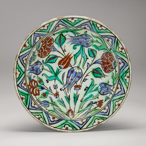 A Kara Memi style dish of glazed fritware painted in red, blue, and green with the remains of gilding on the flowers. The central medallion is ornamented with sprays of carnations and tulips. The large rim is divided into nine sections by large green and blue saz leaves. Within these sections are red tulips, red hyacinths, and tiny blue prunus blossoms on the outer edge. This style of decoration, where four flowers are used, is known as the quatre fleurs motif. Each of these flowers had a specific meaning to the Ottomans: the tulip was the most sacred of the flowers as the letters in its Arabic name (لال / lale) are also used to write the name of God; the carnation was thought to be a symbol of longevity due to its extended blooming period; the hyacinth, with its curling petals, was used as a metaphor for the curly hair of a lover in 16th century Ottoman love poetry.1 The prunus, commonly the outermost floral spray on Kara Memi style dishes, symbolised Paradise.2