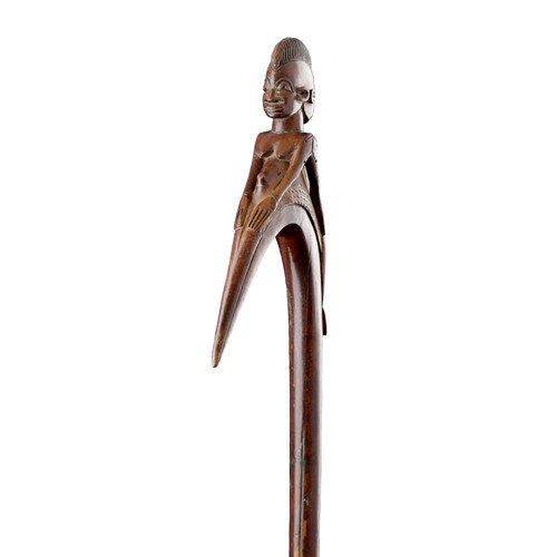 The long handle carved with a double figure a seated female above a standing female both wearing traditional ‘cheriut skirts’