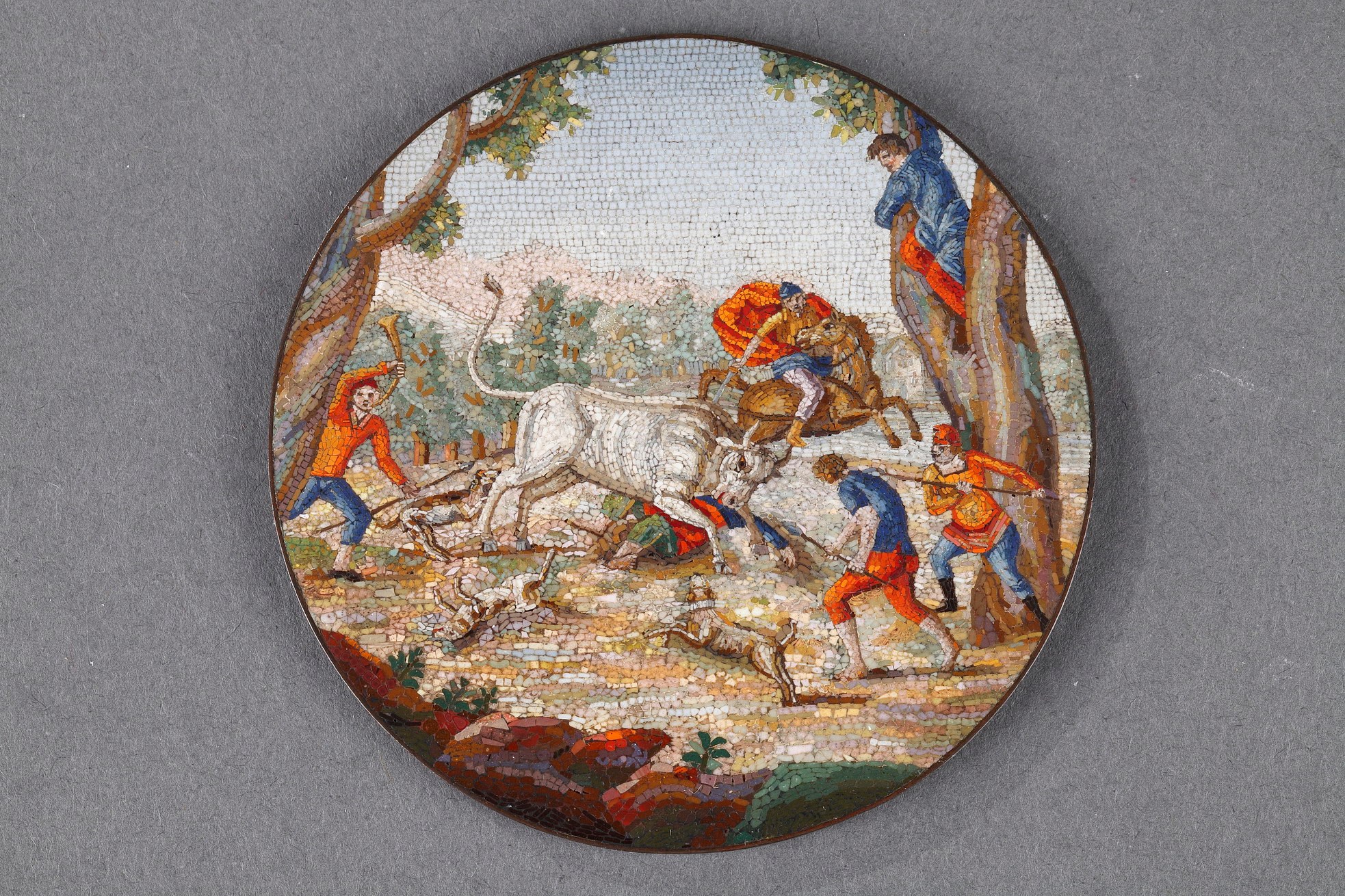 The large case inlaid with amboine wood including sewing-set. The rectangular box is decorated with faceted steel nails. The lid presents a large gouache-enhanced scene representing the union of Cupid and Psyche from the altar of Love. The two characters are puuti features standding in front of a priest. The symbols of marriage are arranged around the altar such as the torch symbol of the Hymen, the quiver symbol of Love and the doves symbol of Venus. The altar carries a monogram AJ.The case includes inside a mirror on the reverse, a velvet top where are arranged the sewing set (eleven pieces): scissors, brush, pliers, needlecase, wool needle, thimble... in mother-of-pearl, gold and steel enhanced by a small enamelled flower "souvenir of the Royal Palace". On both sides, two steel bobbins and four crystal and gold scent bottles complete the set. Under the removable tray, compartments made it possible to arrange the work for sewing and embroidery. This type of kit was offered to young girls on the occasion of their wedding. Few signs of wear. Circa 1820