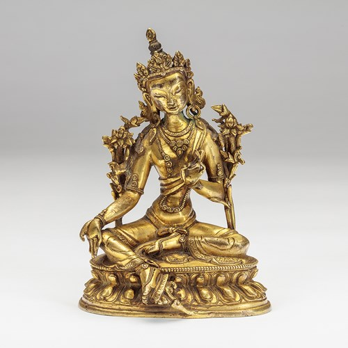 Of silver-gilt, enamelled in blue, green, and red, the ornamentation of this spice box closely resembles the renowned champlevé and basse-taille enamelware made in 18th century Lucknow, in the state of Uttar Pradesh. When the central knop, itself resembling a vase of flowers, is unscrewed and removed, each of the heart-shaped lids is free to open. An ogival pandan in the collection of the Los Angeles County Museum of Art (accession no. AC1993.137.1.1-2) has similarly brightly coloured floral sprays, and mostly notably, both have two birds with maroon bodies and blue wings standing aspectant.