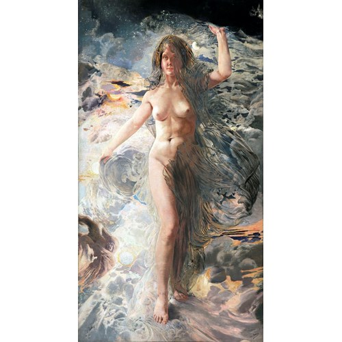Emerging from banks of clouds and sunbeams, the naked figure of Aurora stands before the viewer, separating the morning from the night. Surrounded by a series of moons, suns and an aureole of stars, and clothed in a diaphanous wind-blown garment covering half her face, the goddess of the dawn exemplifies the disturbing art of Léon Frédéric.