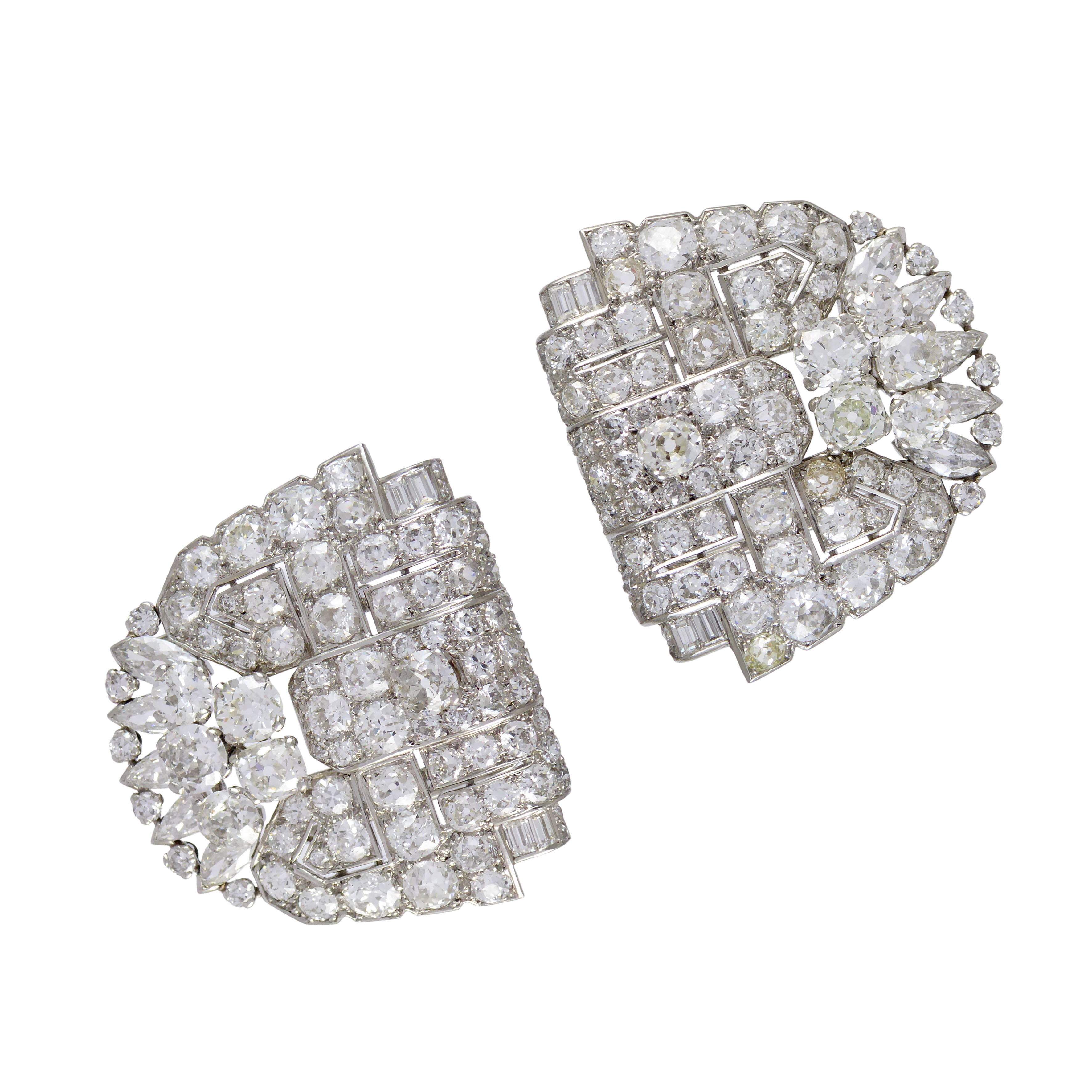 Designed as a trailing S curve stem set along supporting graduated flowerheads, three mounted en tremblant, each with five, six and seven pointed leafy-petals and with single stone to centre, the diamonds of cusion and old brilliant cut, the lower section articulated on a pendant loop and detachable for wear as two separate brooches, the larger one with the tremblant flowers.