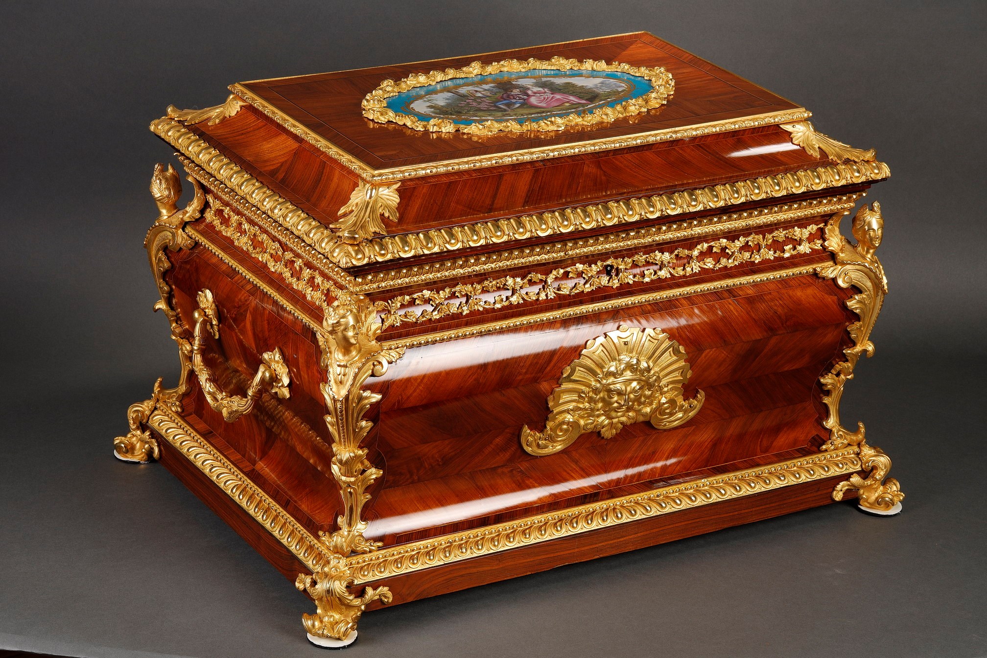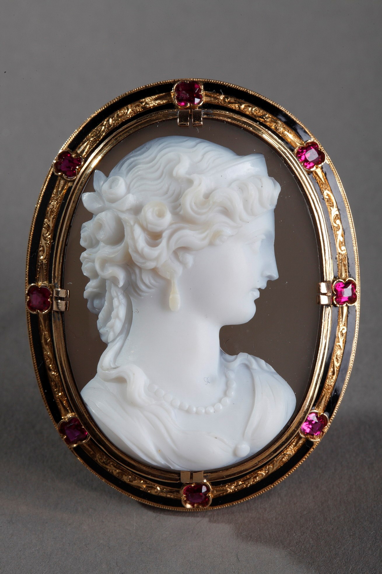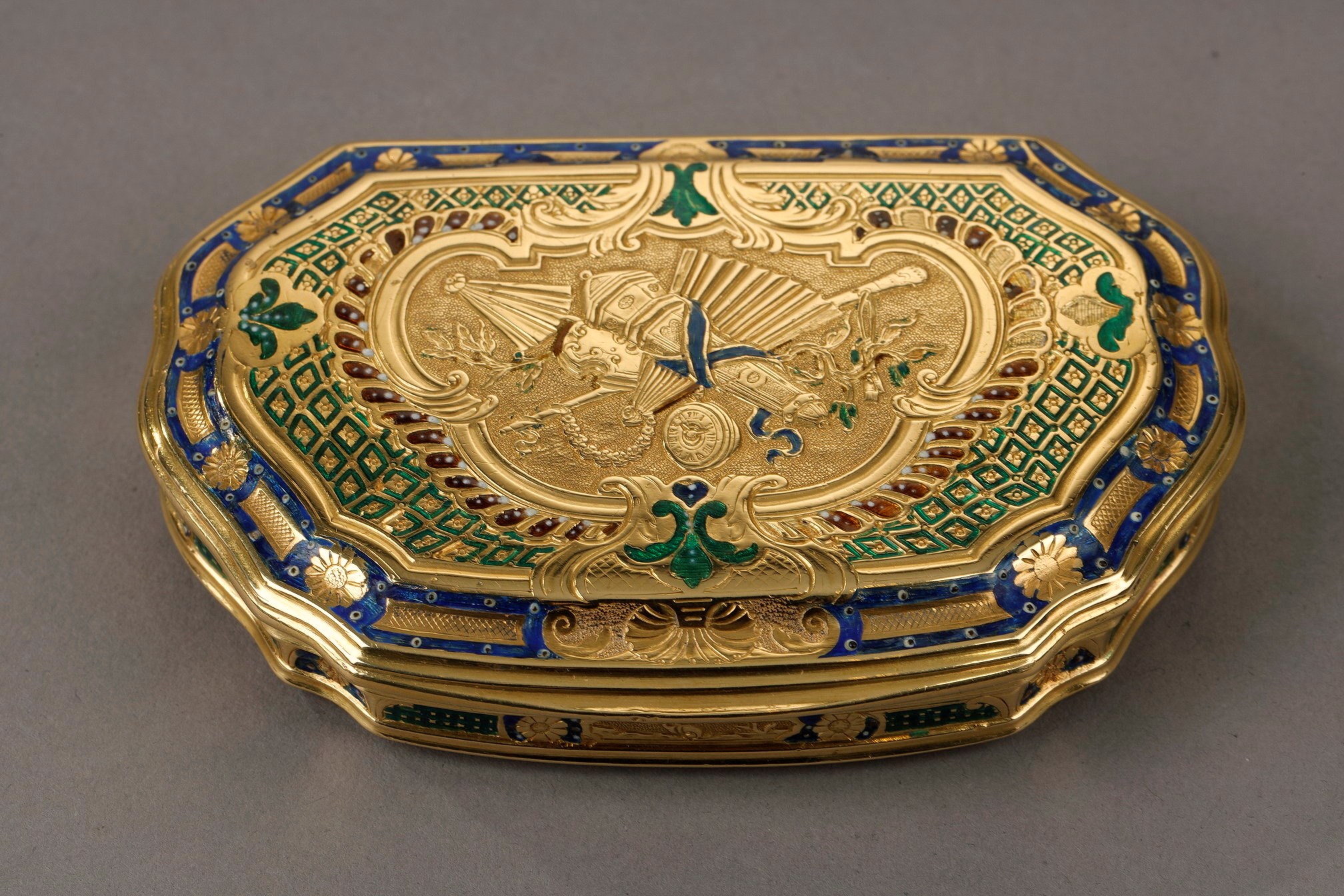 A rectangular box with canted corners, the cover set with an enamel plaque painted in "plein" depicting scene depicting a chariot pulled by women dressed in antique dress. This scene is inspired by the fresco depicting the chariot of Apollo drawn by the Aurora and the nymphs and painted by Guido Reni in the 17s for the Palazzo Pallavicini-Rospigliosi in Rome. This scene is framed by pale blue and white enamelled motifs and gold circular motifs left in reserve. These same motifs are found on the sides and the base. The canted corners of the sides are decorated with antique vases. One side of white enamel is slightly missing.