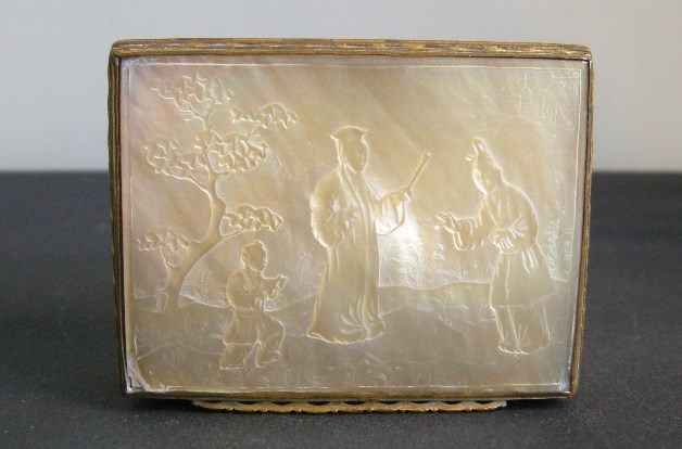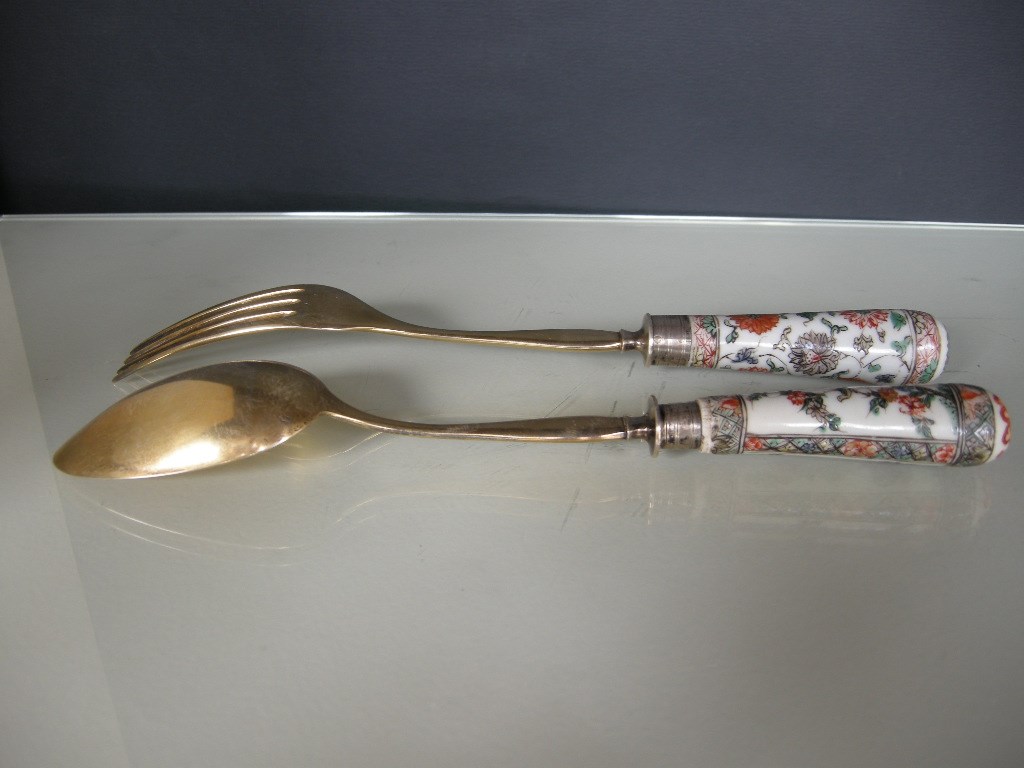 Chinese "famille verte" porcelain and vermeil fork and spoon decorated with birds and flowers.