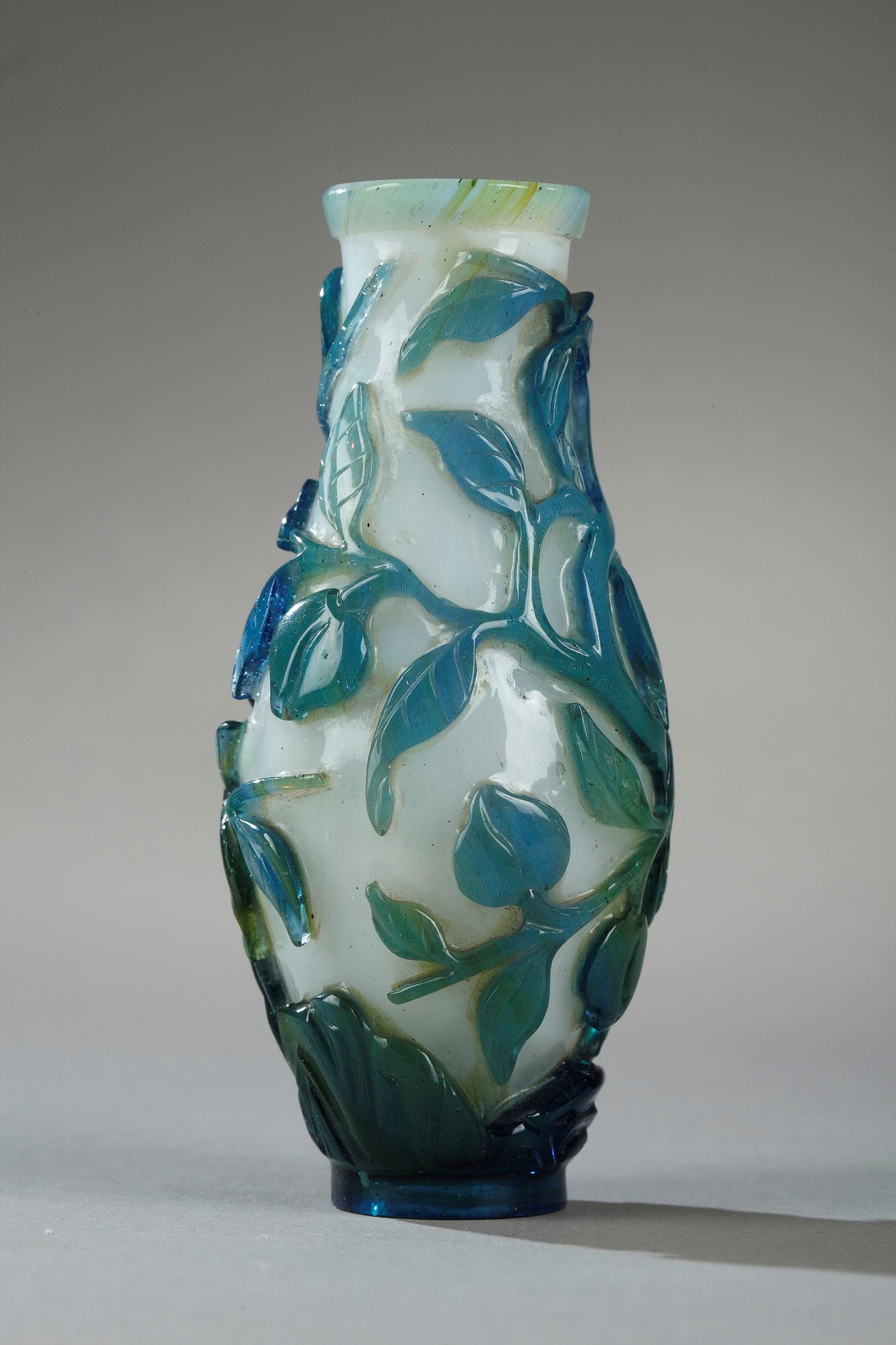 Small vase overlay glass turquoise blue, green on ground white opaque decorated with longevity peach and foliage