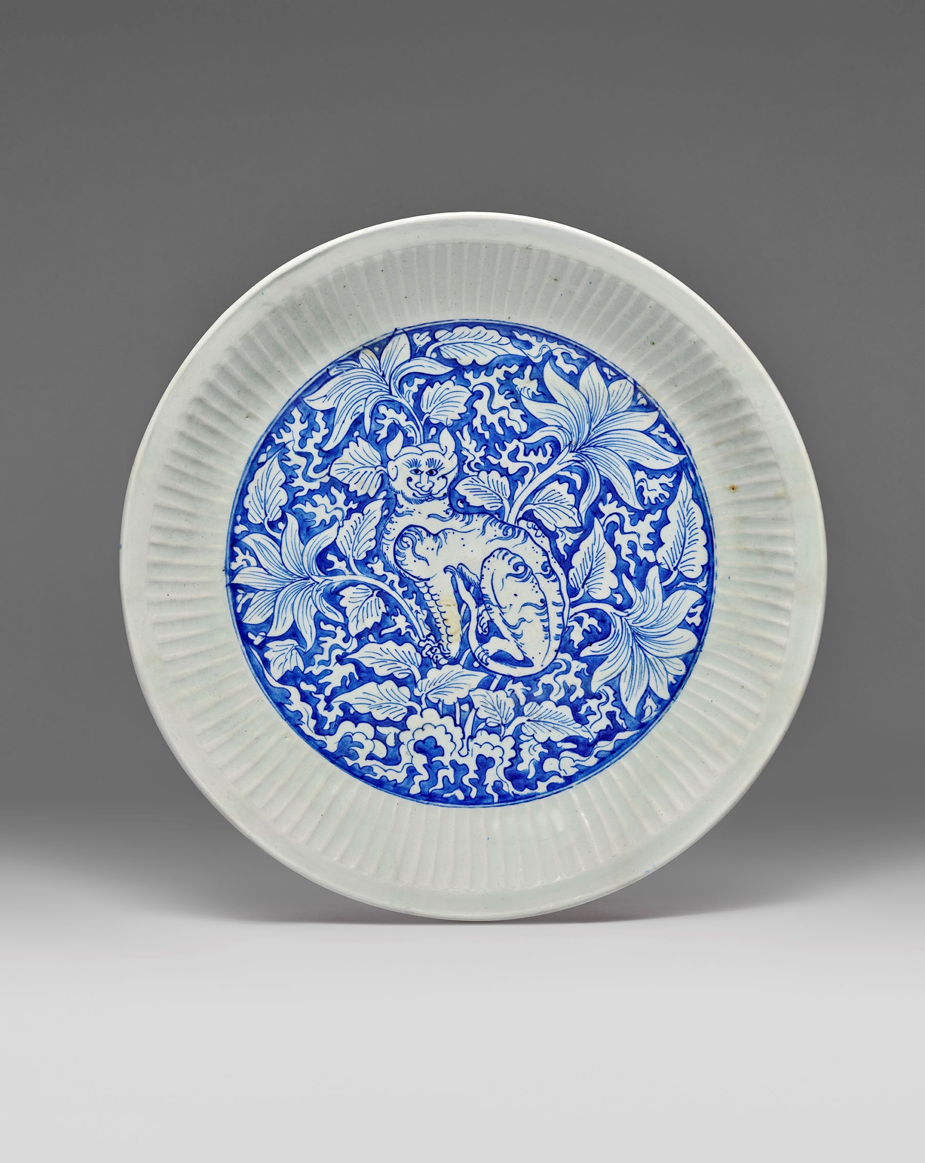 Although the taste for Chinese blue-and-white porcelain in the Middle East and Europe in the early modern period is widely known, its link with the Indian subcontinent remains little explored. A hoard of 14th century Chinese blue-and-white porcelain discovered at Feroz Shah Kotla in Delhi points Indian rulers’ interests in Chinese porcelain since the Delhi Sultanate period. Blue-and-white vessels were later continuously depicted in Mughal manuscript paintings as an essential part of serviceware for royal feasts. It is well-known that blue-and-white porcelains inspired by Middle Eastern metalwork had been produced in China since the 15th century and would have been exported as luxury goods to the Middle Eastern market. Similarly, blue-and-white porcelain modelled on Indian metalwork were exported to the Indian market. Our ewer is an example of this, for its shape can be traced to 17th century Indian metal ewers.