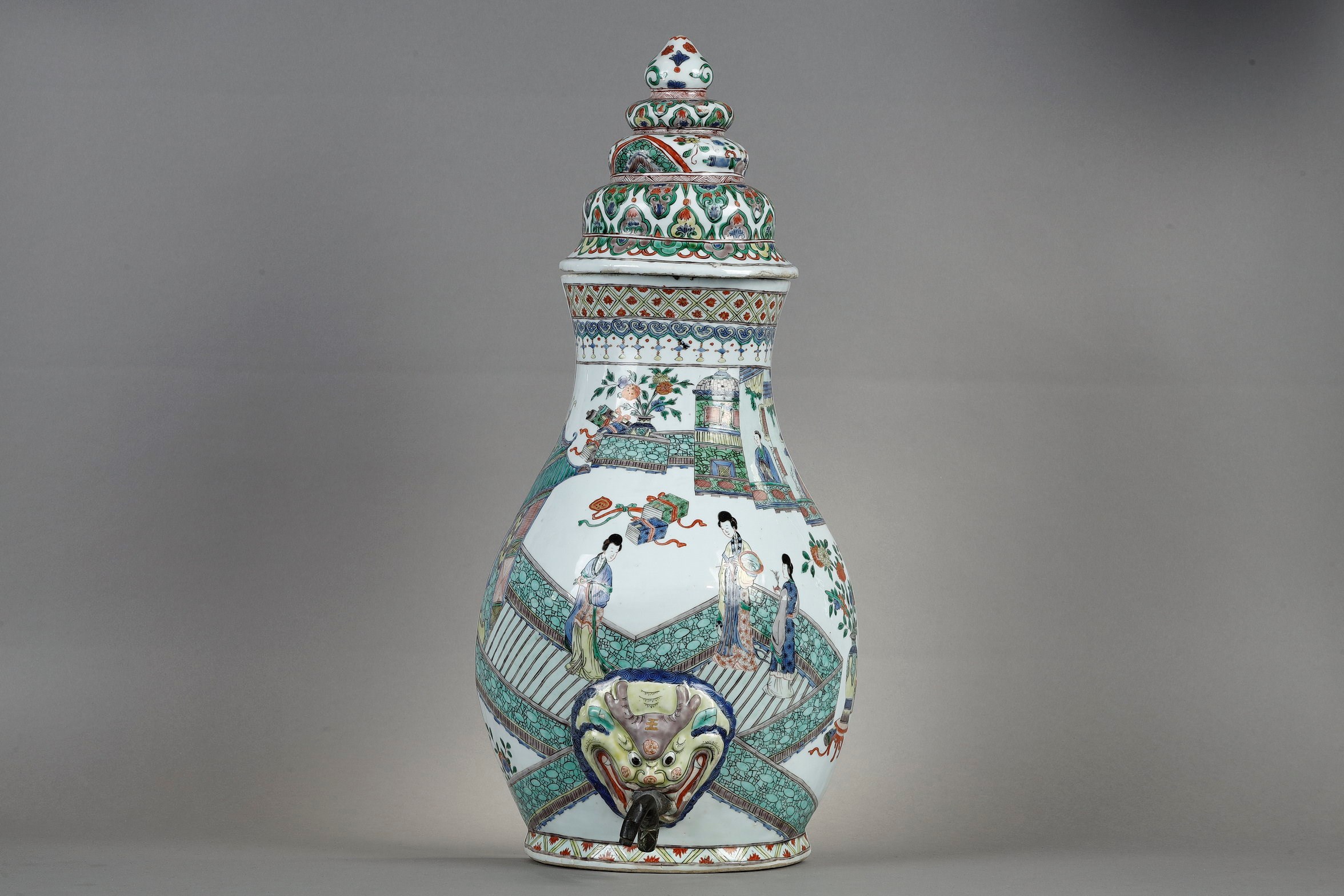 Figure seated in biscuit "Famille verte" with a golden bronze headdress the bronze probably occidental