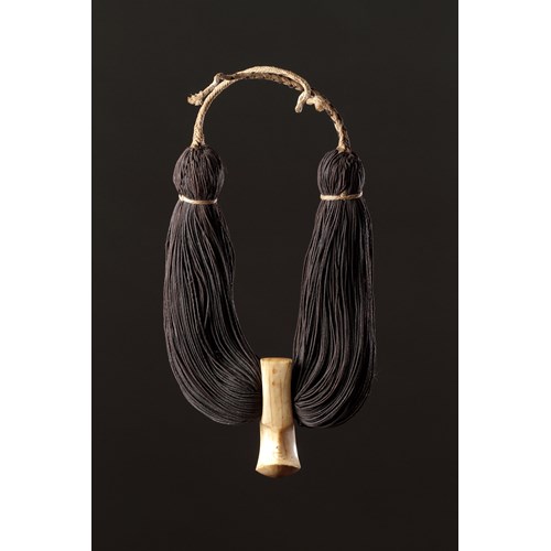 Literature: Like the crowns of European royalty, hook shaped pendants made from the teeth of sperm whales were worn by Hawaiian ‘Ali’i’ as marks of noble birth. They served as visual symbols of exalted status and could be worn by persons of high rank of both genders. Often worn on necklaces made from tightly braided coils of human hair in multiple strands strung with finely plaited and braided Olonā fibres. ‘Touchardia Latifolia’ is commonly known as ‘Olonā’ in Hawaiian and is a species of flowering shrub that belongs to the nettle family. It has always been cultivated on Hawaii and was considered one of the finest grades of fibre, its intertwining strands making it one of the strongest natural fibres on earth. It was often used as cordage on the wrist loop of ‘pāhoa’ daggers, and for fastening sharks teeth on the heads of ‘Leiomano’.