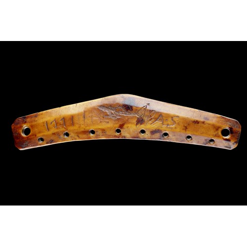 Literature: Unlike other hand clubs elsewhere in the world used for bludgeoning downward blows, Maori ‘patu’ were designed for jabbing and thrusting movements, for quick fighting in which a split second was too important to waste in raising the weapon to strike a blow. The whalebone was cut from the pan-bone of a sperm whale with a sandstone saw. Grooves were then cut from the front. The back was then sawed away to take out the resulting slab. This was then formed into a club shape by chipping and sawing with stone tools. Each individual club was weighed and balanced to suit the hand and preference of the warrior for whom it was being made. Such clubs were used over many generations and became associated with the Maori who wielded them. These heirlooms were ‘Taonga Tuku Iho’ – treasures passed down from the ancestors.