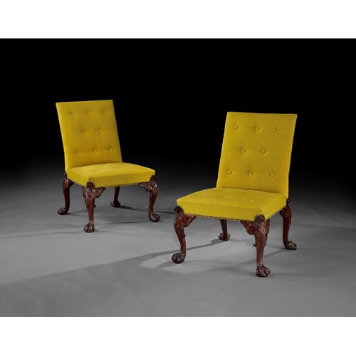 This chair is a simplified version of an important pair of mahogany open armchairs with pierced backs likely supplied by the London cabinetmaker William Hallett Sr. (c.1707-1781) to Anthony Ashley-Cooper, 4th Earl of Shaftesbury (1710-1771) at St Giles House, Dorset, in c.1745-46 (sold Christie's London, 5 December 1991, lot 63; £275,000). In the 20th century they formed part of the celebrated collection of Samuel Messer, one of several iconic collections of English furniture and clocks assembled under the guidance of the renowned historian R.W. Symonds. The Messer chairs share the same pierced serpentine back with identical moulded toprails with central beading and radiating vasiform splat with angled scroll edges on the shoulders, as wellas similar moulded outward scrolling armrests.