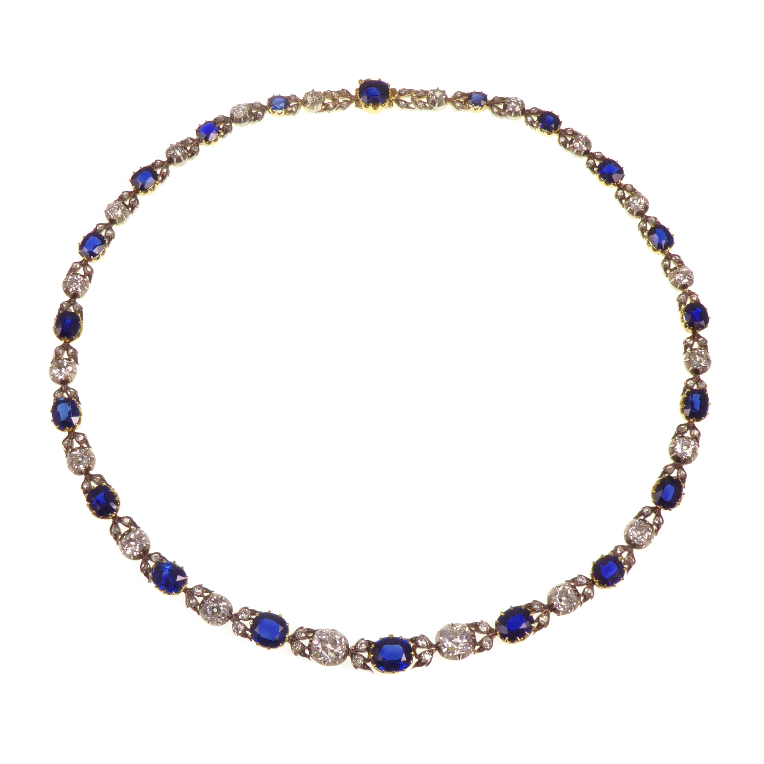 Antique cushion cut sapphire and diamond graduating necklace, c.1890,