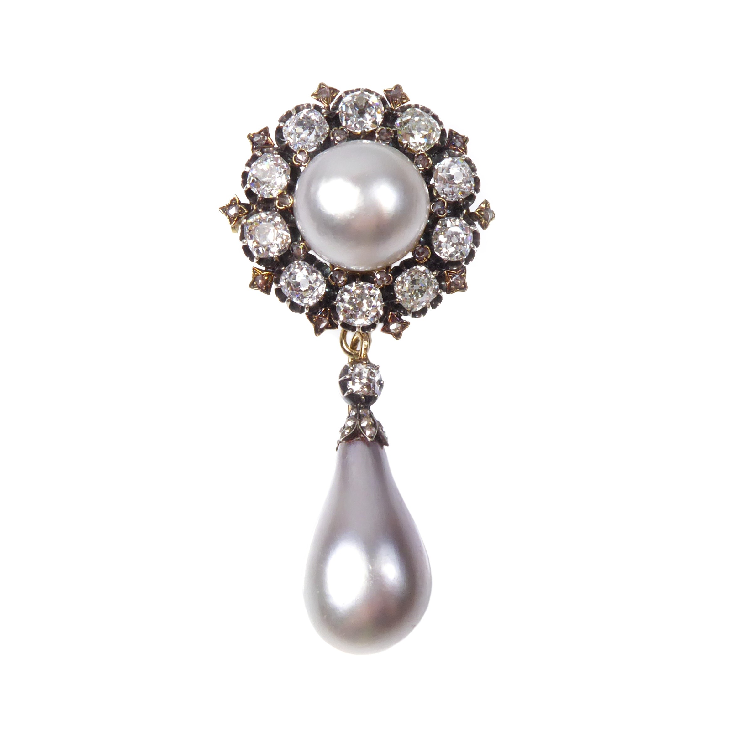 19th century natural pearl and diamond drop cluster pendant-brooch, c.1880,