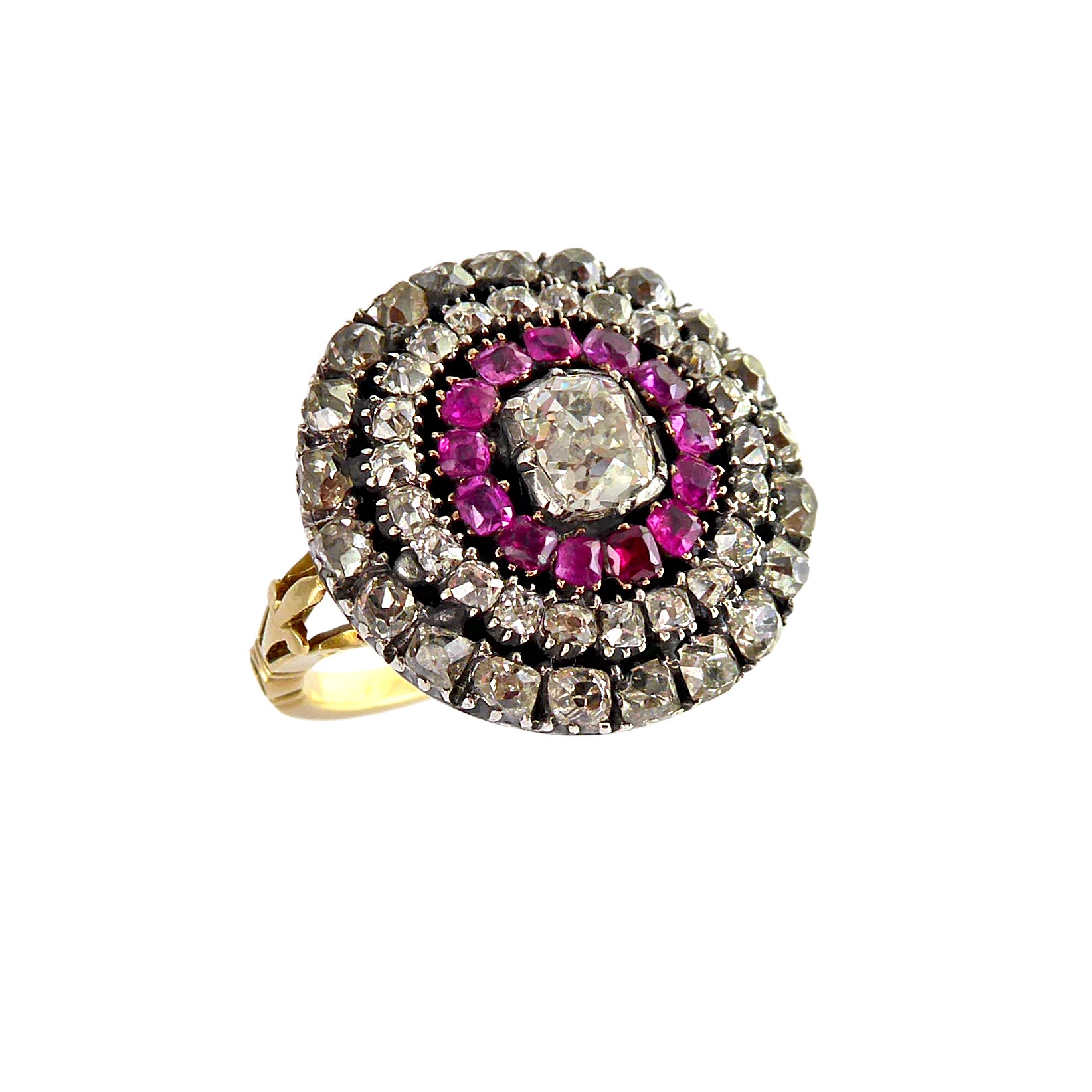 Late 18th / early 19th century cushion diamond and ruby cluster ring, c.1800, slightly domed,