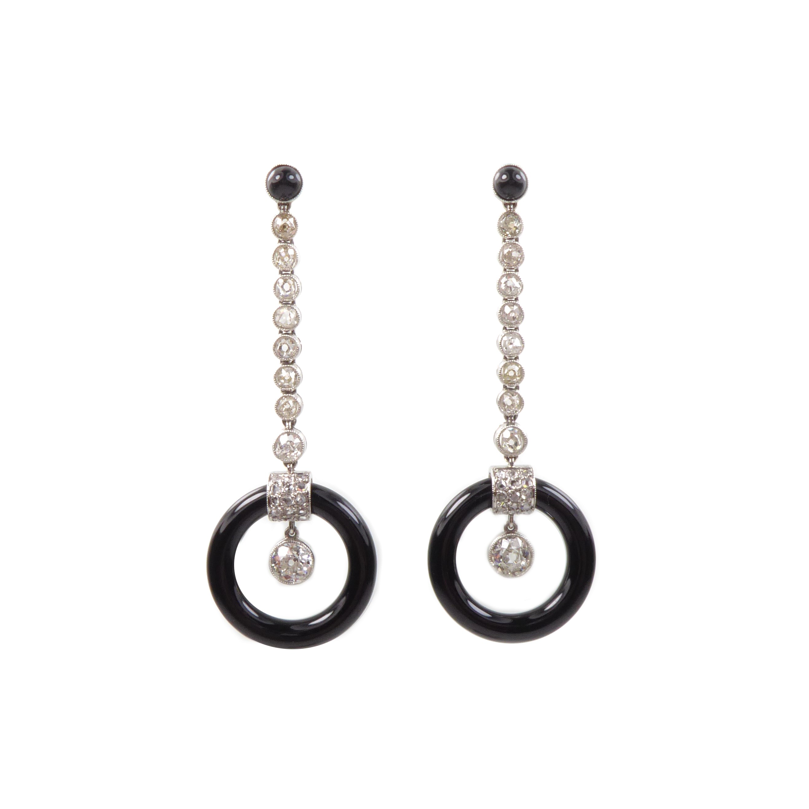 Pair of Art Deco onyx circle and diamond pendant earrings by Henri Picq, Paris,