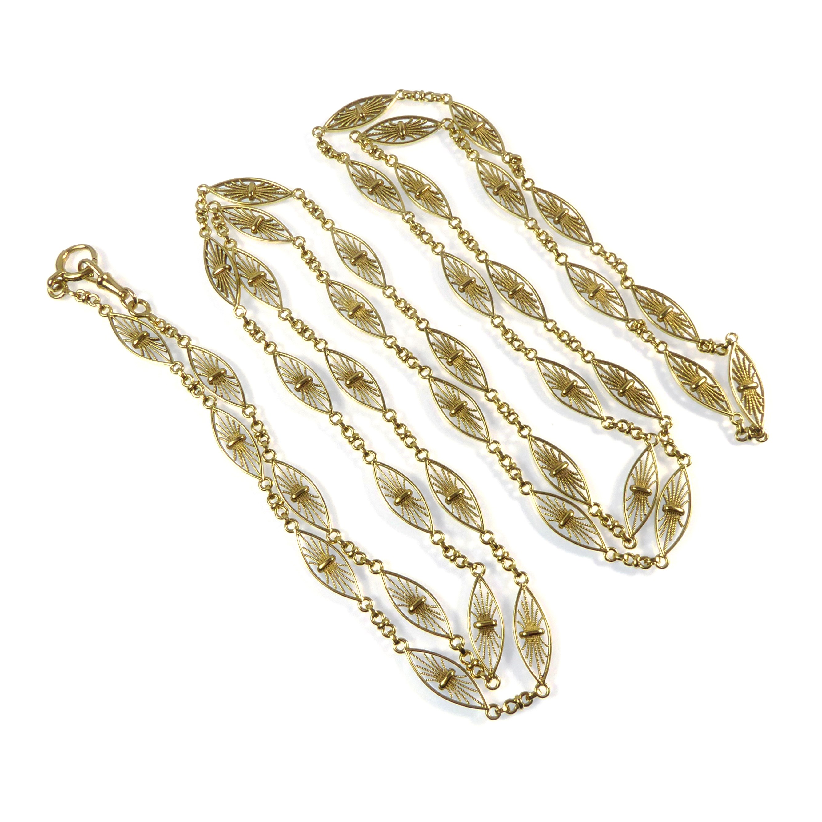 Antique 18ct gold long chain necklace with navette shaped links, French c.1900
