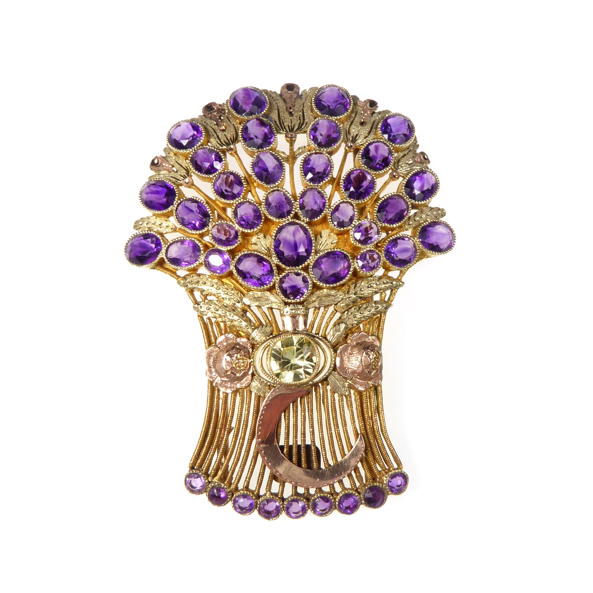 Early 19th century three colour gold and amethyst wheatsheaf buckle-pendant, c.1810,