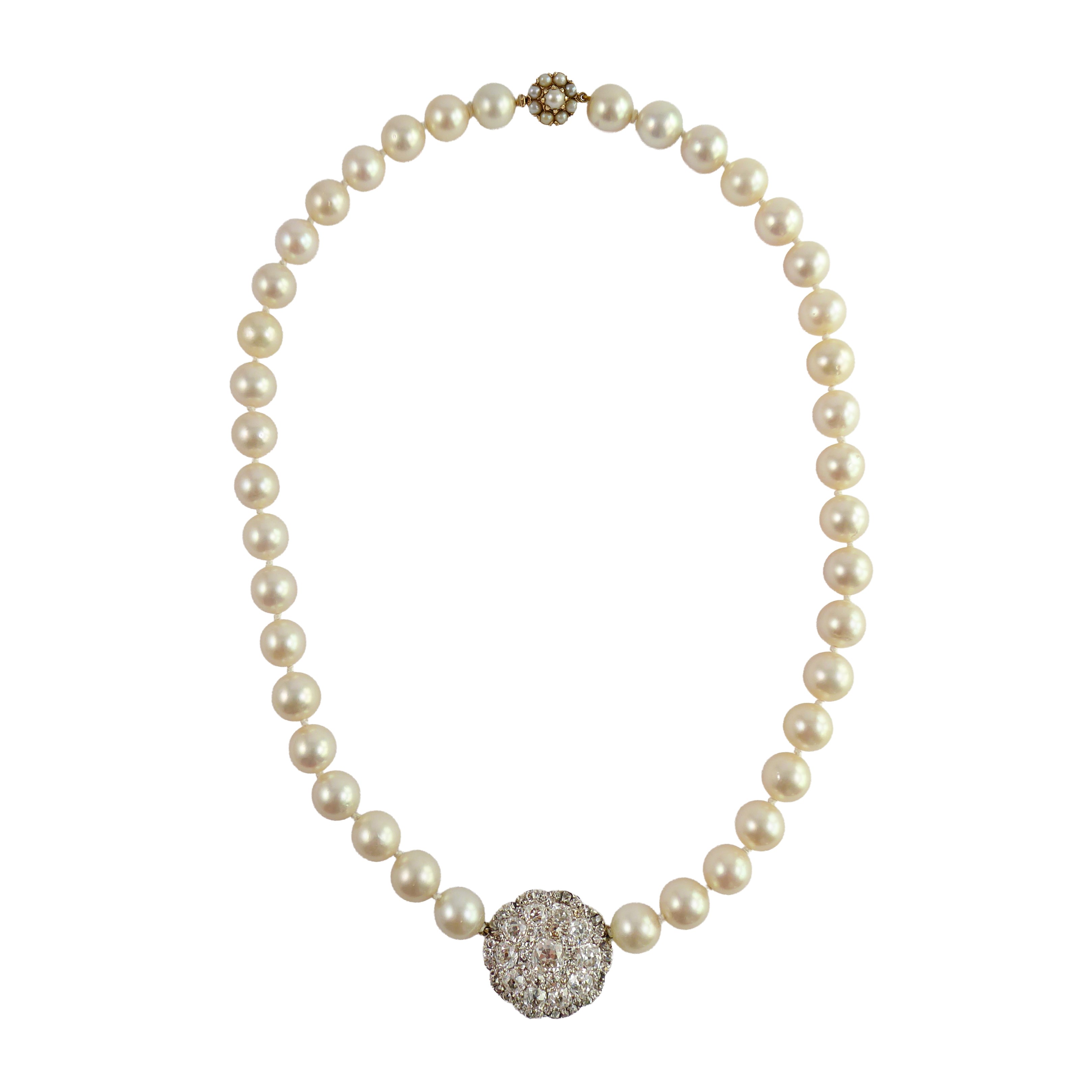 18th century cushion cut diamond cluster panel, c.1780, with a scalloped edge, currently as feature panel to a late 20th century single row cultured pearl necklace,
