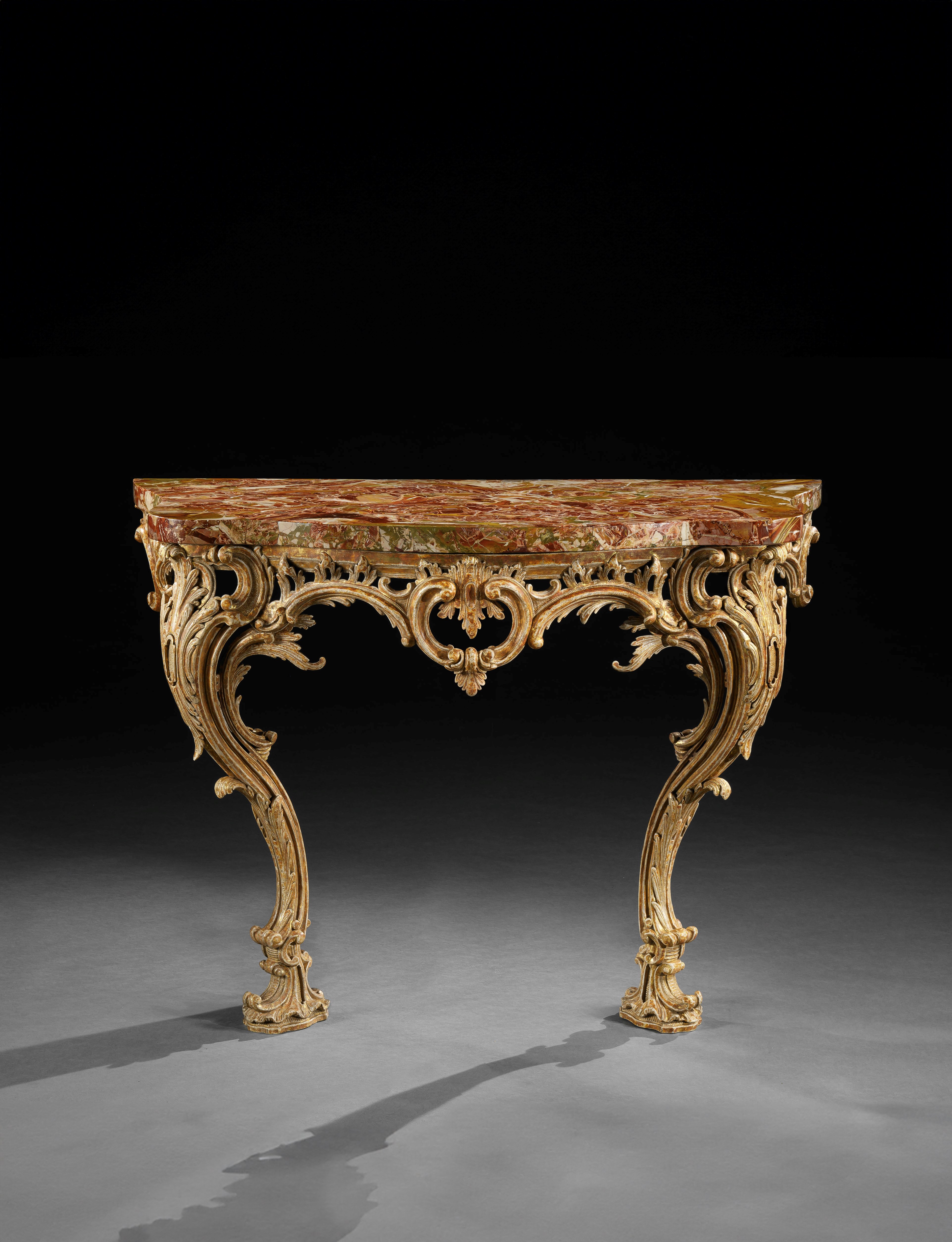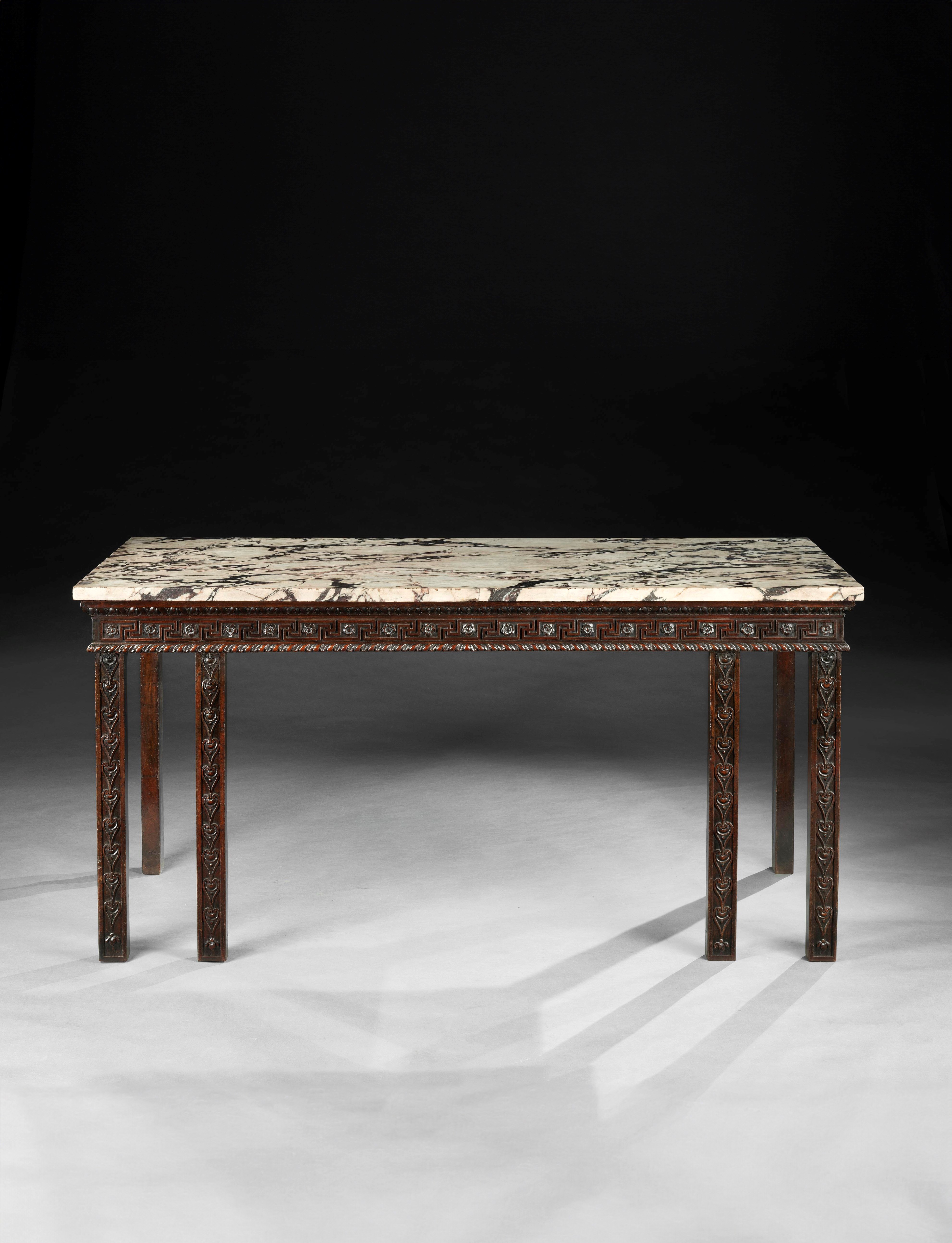 This exceptional table is inspired by the designs of William Kent (1685 - 1748) in particular, the bold architectural form and imprecated ‘fish scale’ reserves, adorned with festoons of flowers and fruit are classic elements found in his designs. While this table is ‘Kentian' in overall style, the distinctive clustered column legs with foliate volutes also link it to Matthias Lock, who drew a table of similar structure and design, now in the Victoria and Albert Museum.