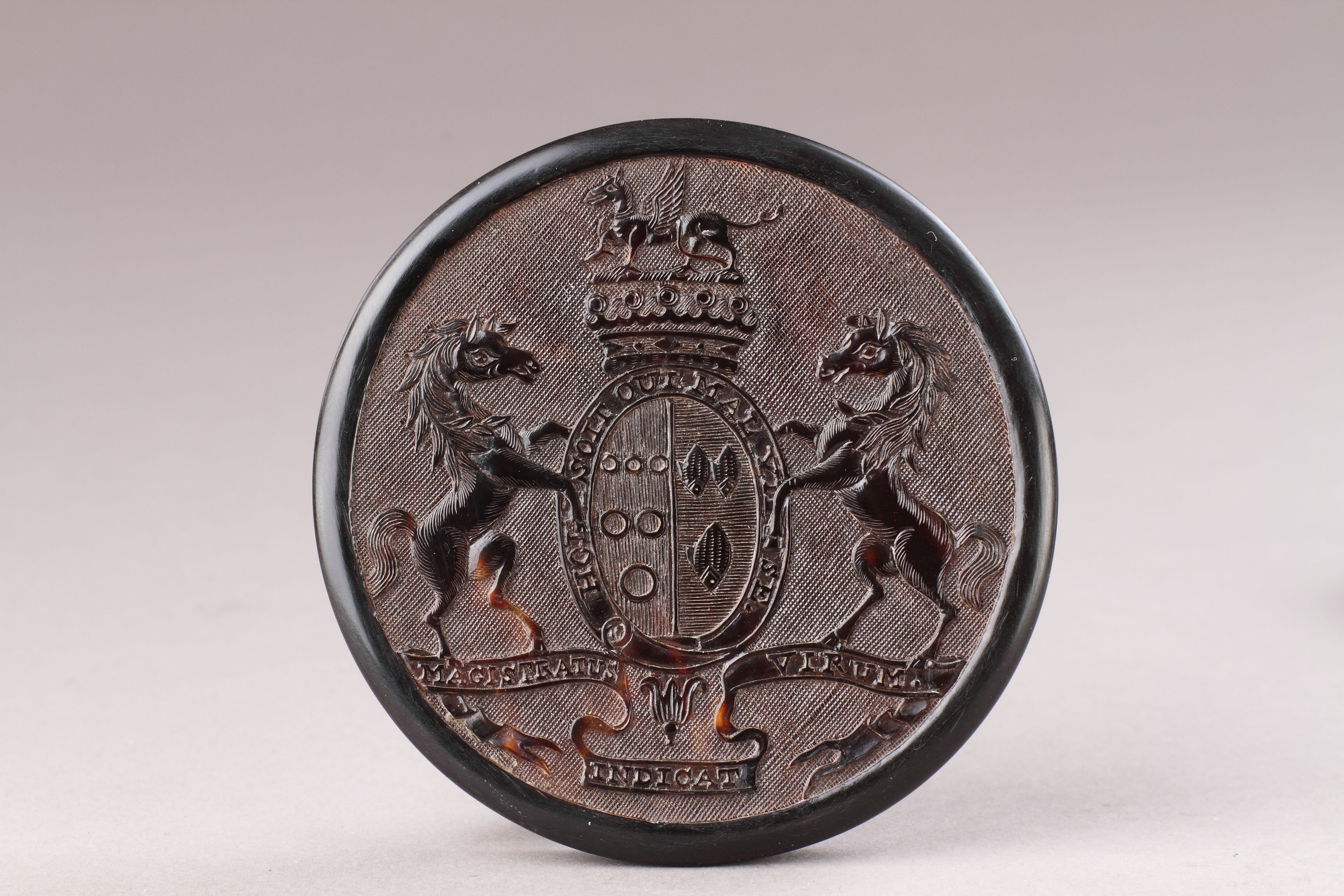 English Pressed Tortoiseshell Snuff Box Decorated with the Armourial of the Earl of Lonsdale