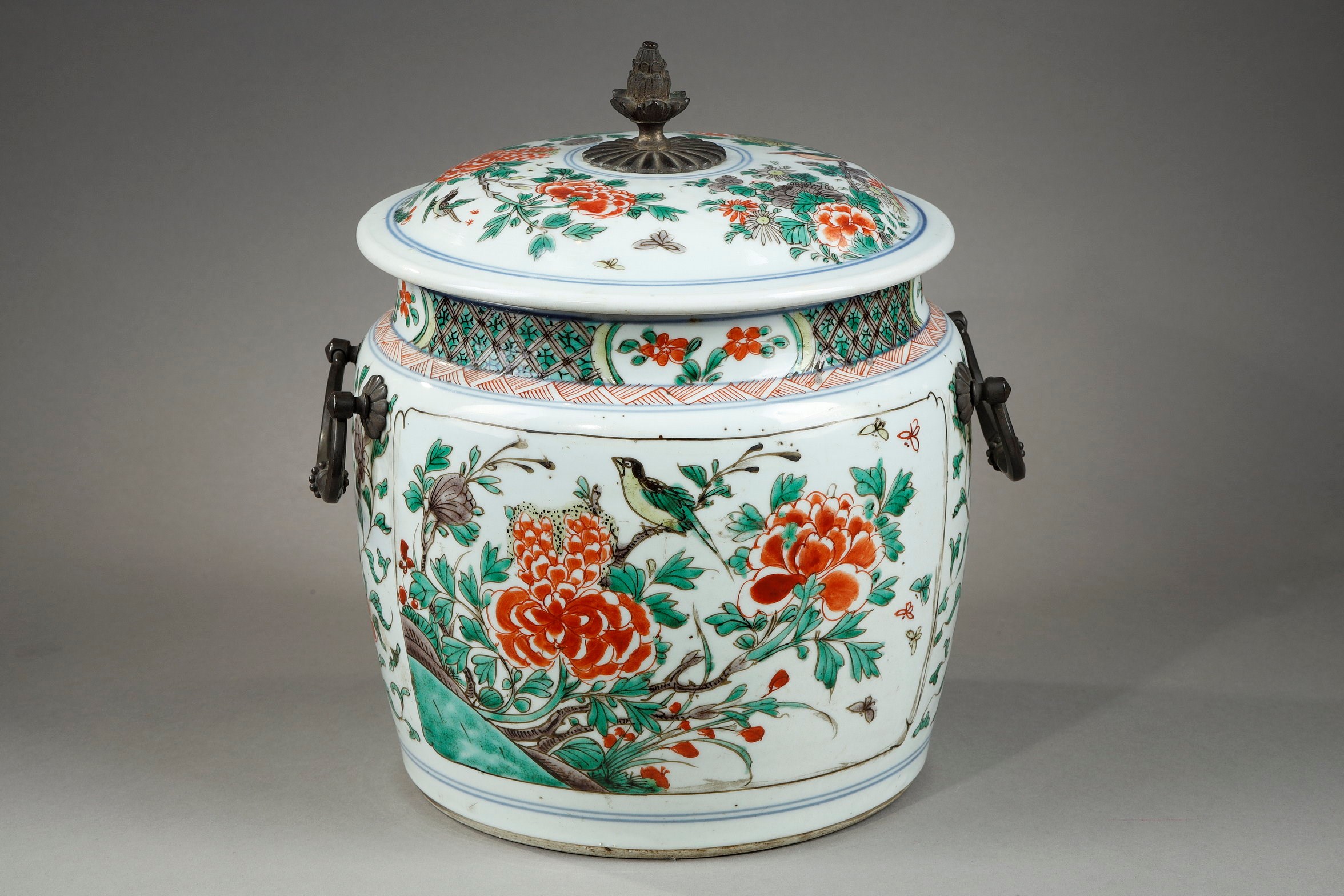 Large porcelain fountain from the Famille Verte with a decoration of characters in a landscape China period Kangxi 1662/1722