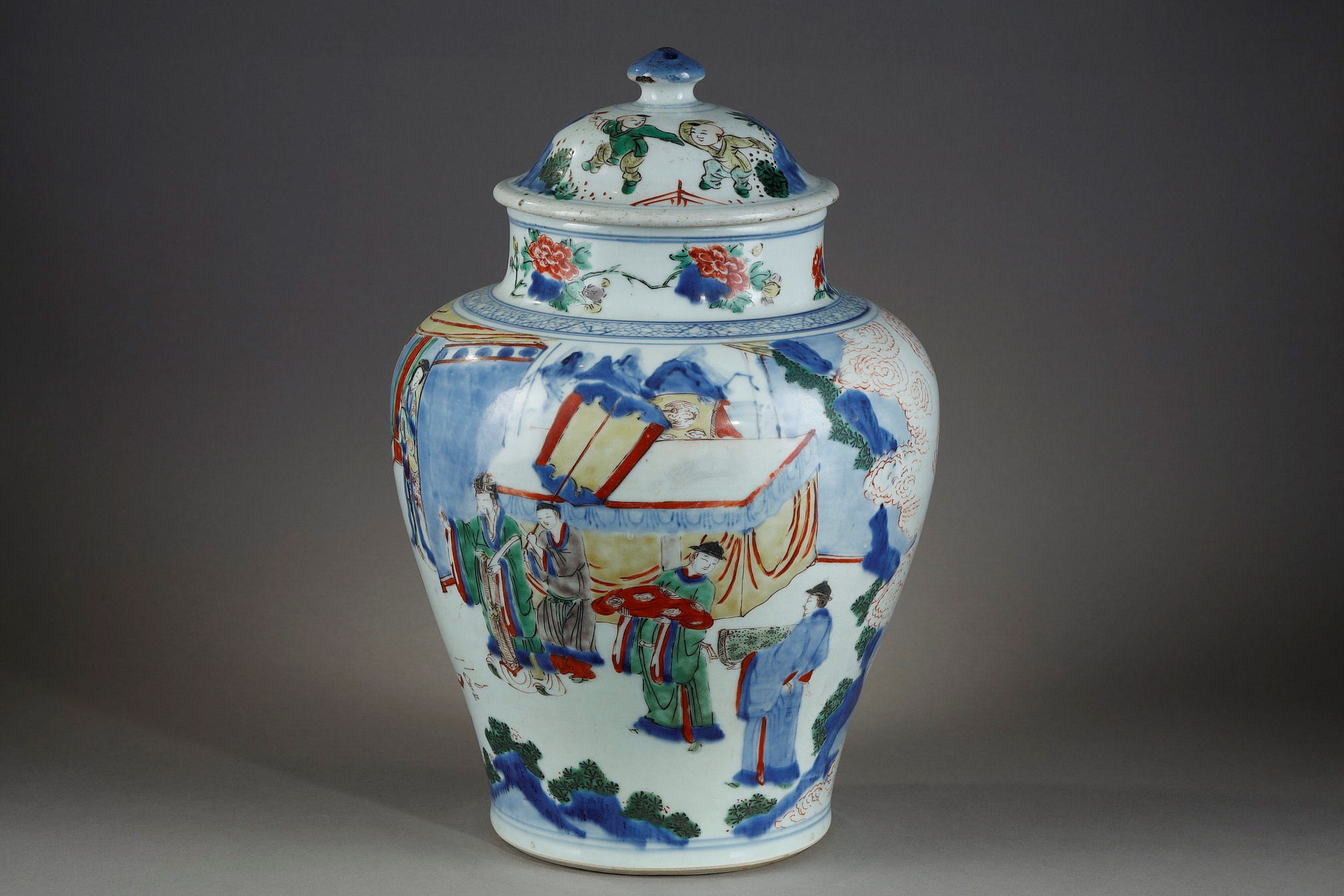 Large porcelain fountain from the Famille Verte with a decoration of characters in a landscape China period Kangxi 1662/1722 H . 55cm