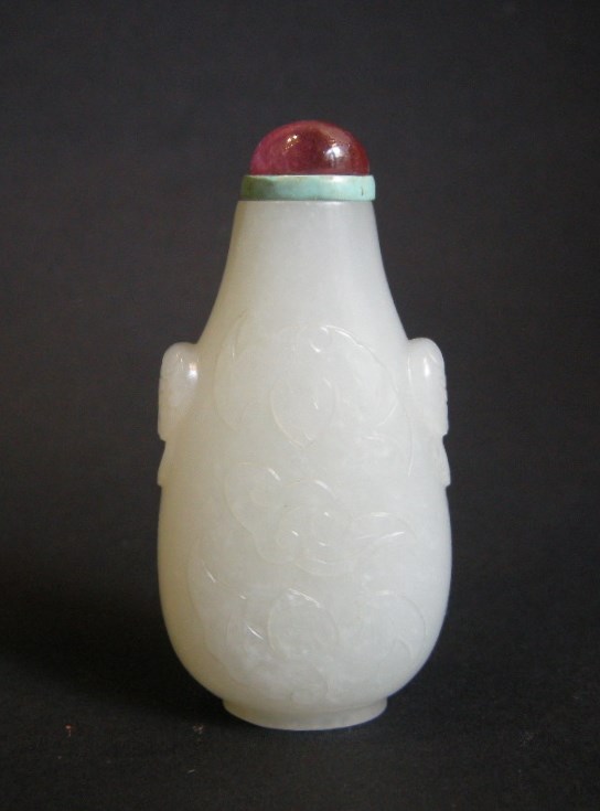 Snuff Bottle white jade in pear shape sculpted with bats and cloud -1750/1820