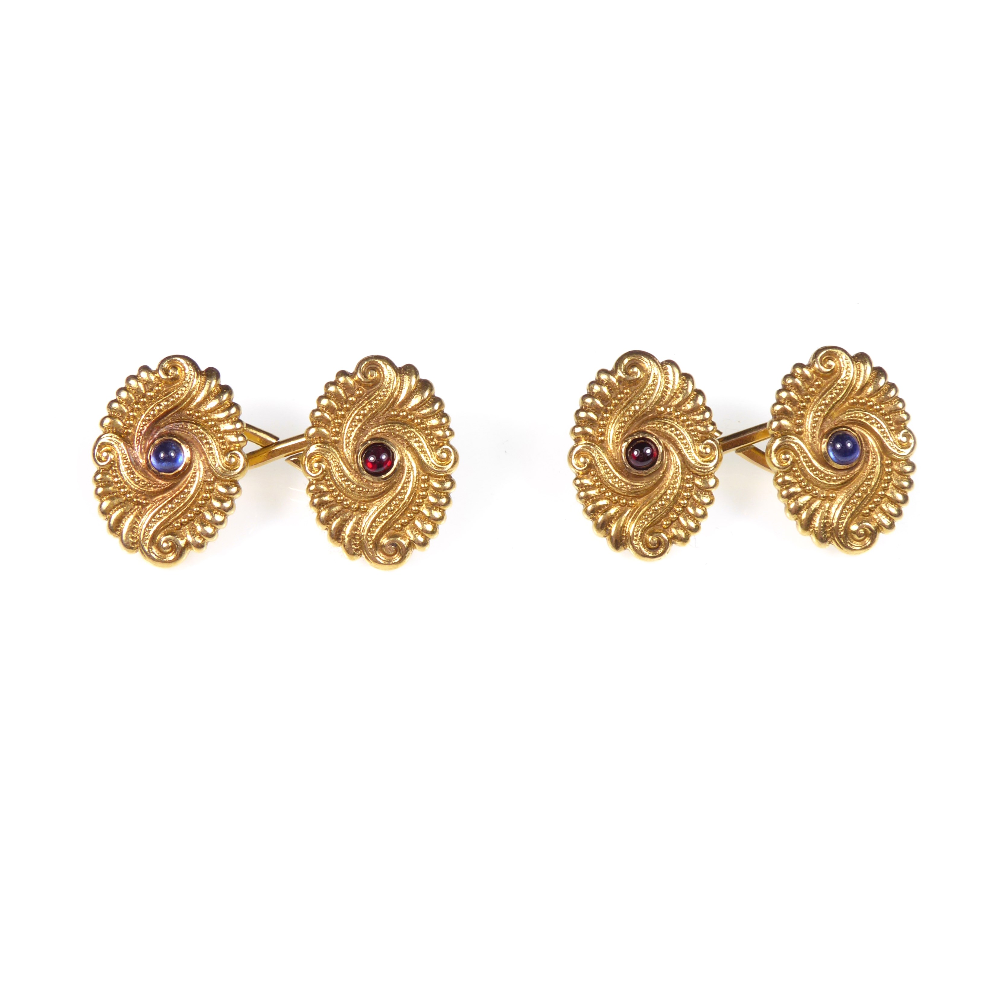 Pair of Art Nouveau 18ct gold, sapphire and emerald oval cufflinks by Dreicer, New York c.1895, with beaded and fluted spiral pattern in relief,