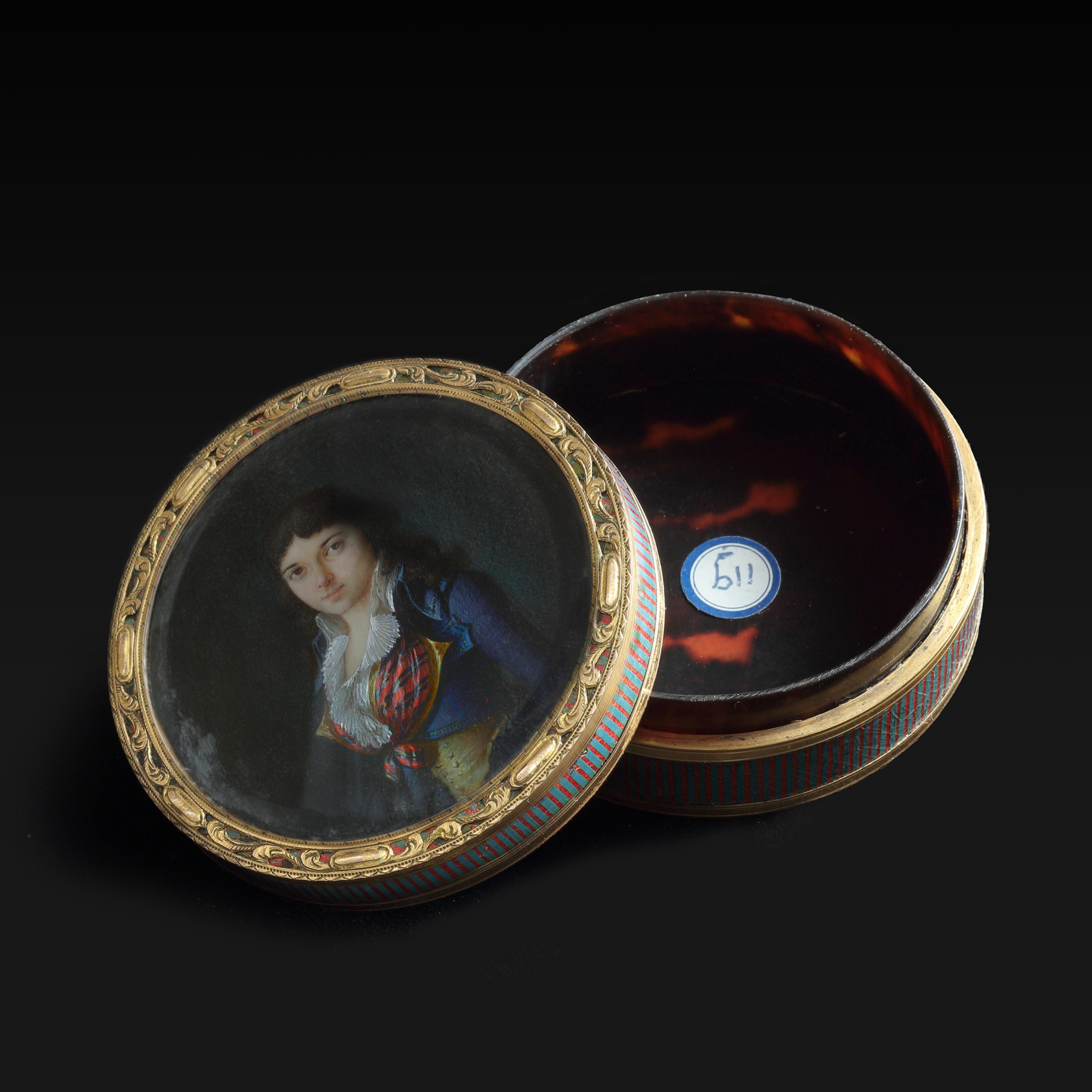 The size of this miniature suggests that if it were worn, it would be quite the statement on the part of the wearer (contemporary paintings do show women wearing miniatures of this size, however impractical we think that might have been). Although we have been unable to pinpoint an artist, the painter was clearly highly trained and influenced by miniaturists such as Antoine Vestier (1740-1824), who was also able to render such detail and texture in watercolour.