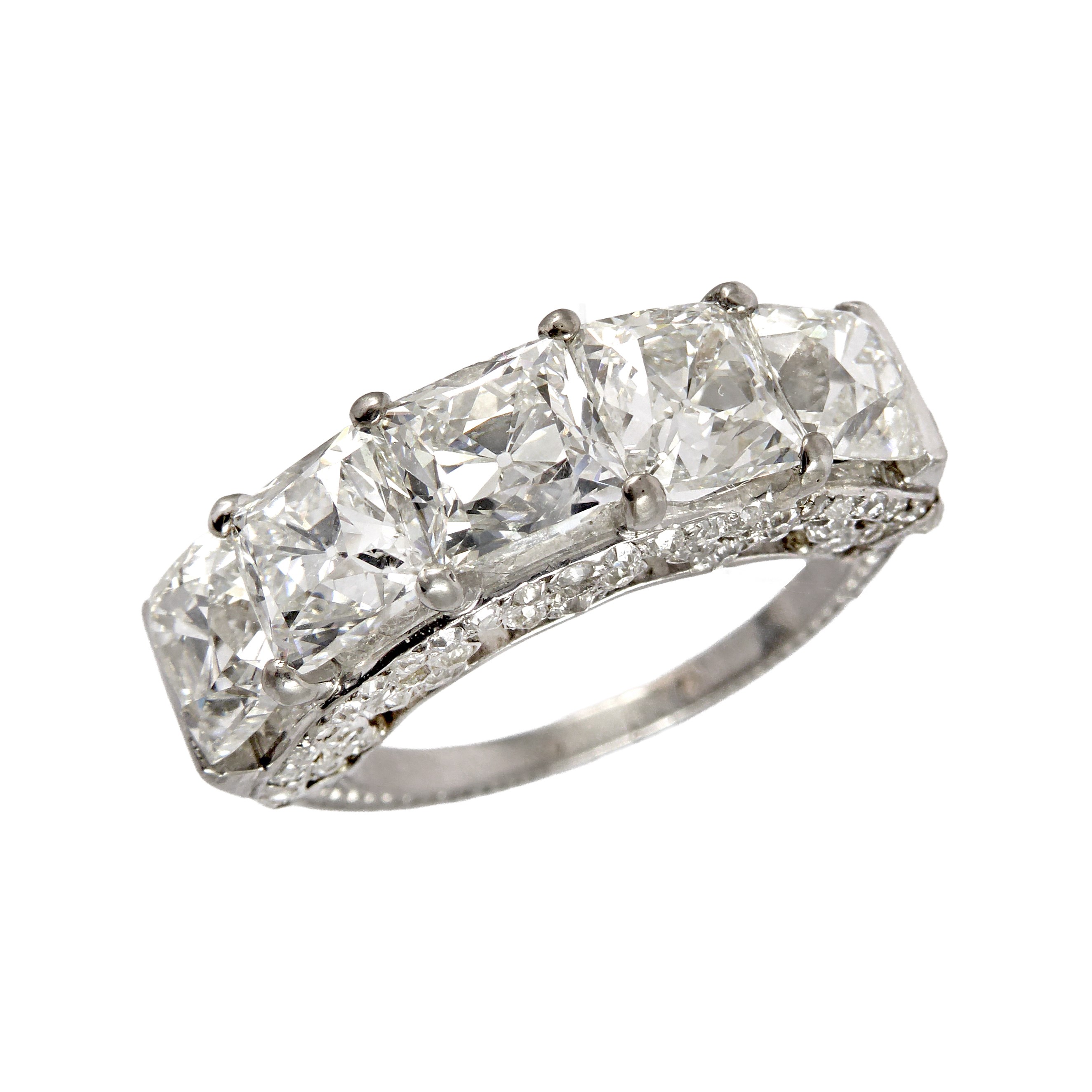 Five stone emerald ring, with graduated Colombian emeralds, the largest to centre of approximately 1.30ct, further emerald set shoulders and accent diamonds,