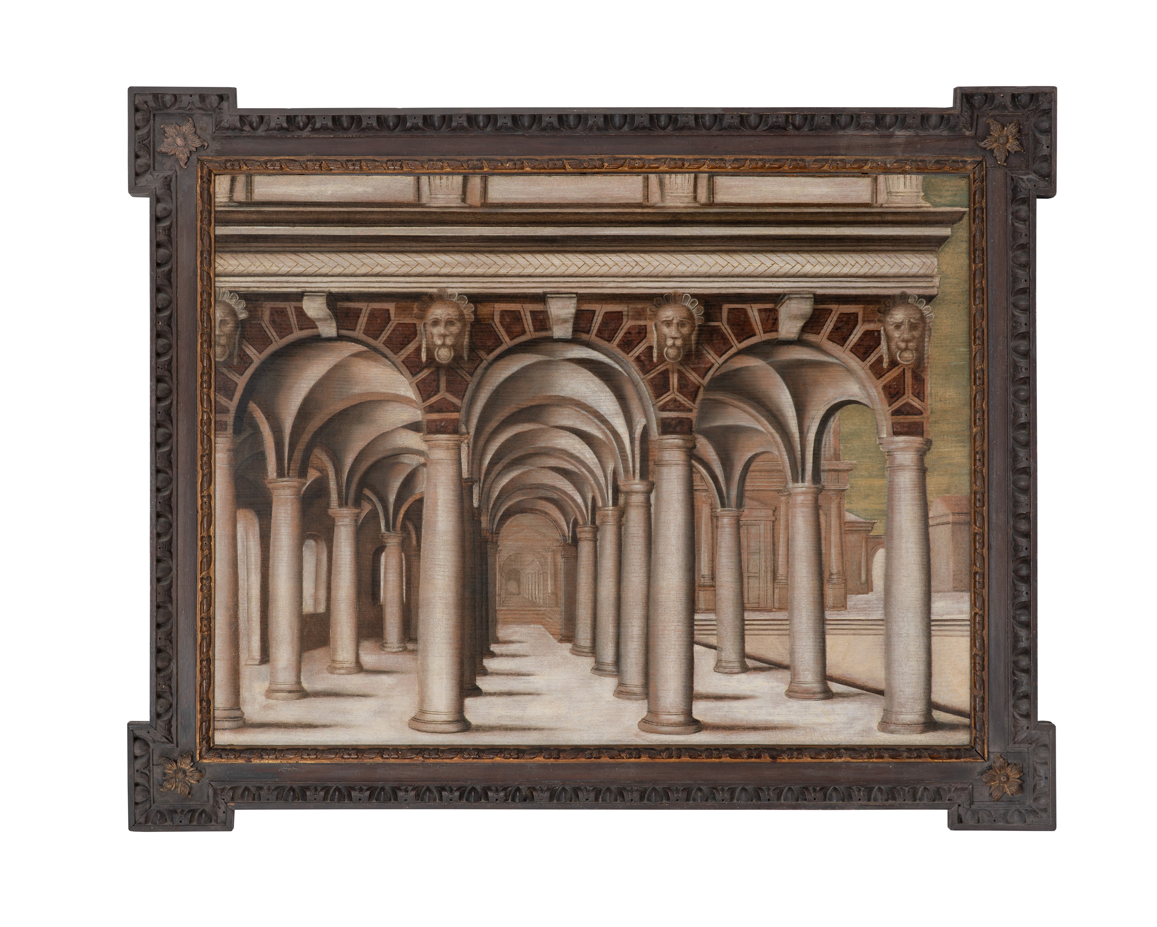 with winged putti holding garlands of laurel on volutes, interlacing flowers, foliage