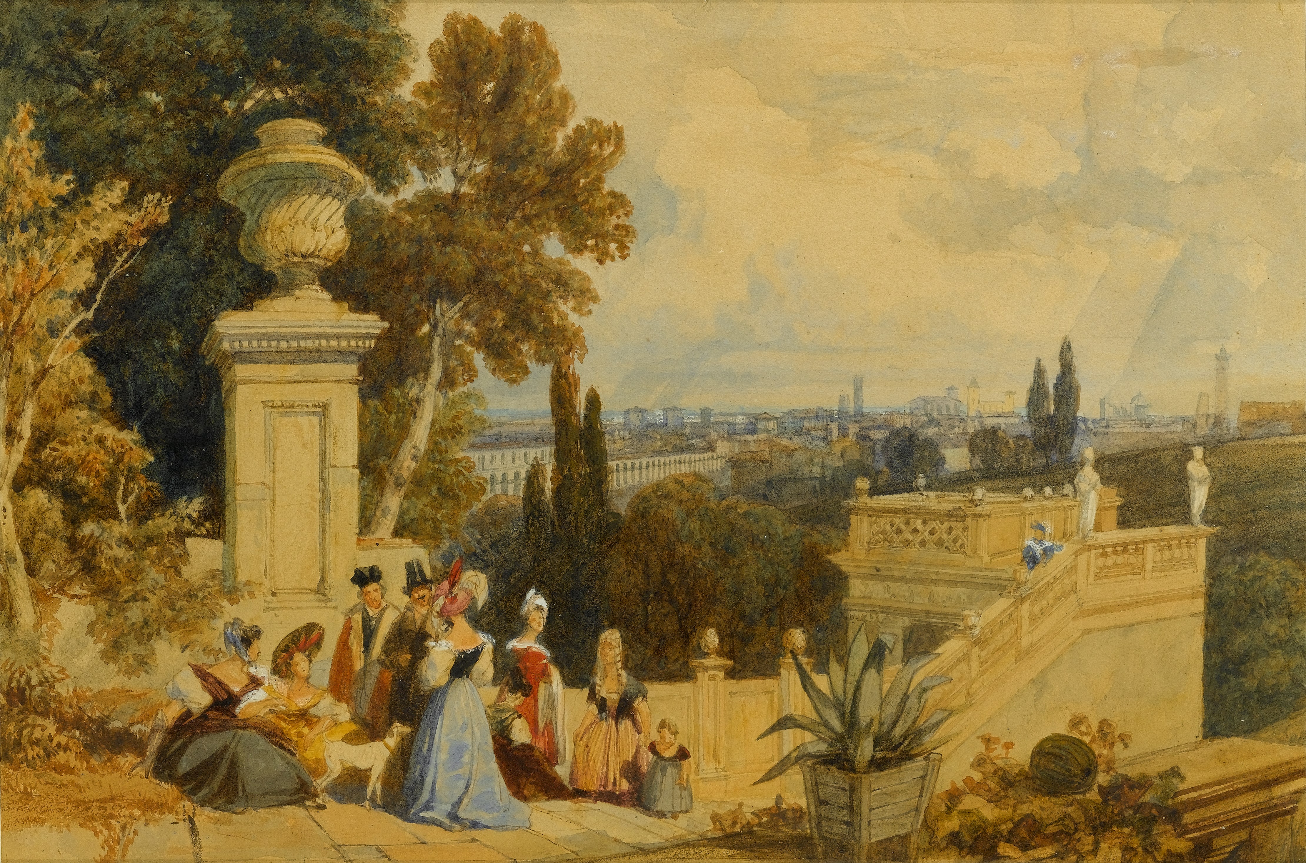 In Drawings and Watercolours in Russian Culture, Yevgenia Petrova writes that in Karl Pavlovich Bryullov’s paintings, ‘features of a Romantic perception of the world were closely linked to the classical relationship with art, the world and its ideals’.¹ In this beautifully composed and evocative view of the Roman Forum, Bryullov demonstrates his academic grounding in Classicism, combined with the Romanticist tendencies that brought him renown. ‘The Great Karl’, as he was known to his contemporaries, was a pivotal early nineteenth-century artistic figure, straddling the schools of neo-Classicism and Romanticism, and was the first Russian painter to gain widespread recognition in Europe.
