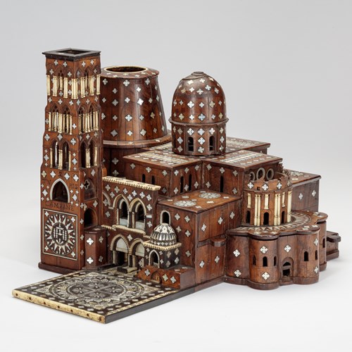 Another helmet from the Qajar era in the Metropolitan Museum of Art, New York, Accession Number 02.5.7, bears a similar allover decorative composition to ours. Although it lacks the chiseled arabesque patterns, there are more figural imagery on the medallions and pendants, and on the ends of the nose guard. Further examples with slight varying decorative schemes can be found at The British Museum, London, Accession Numbers 1878,1230.772 and OA+.6203; and at the Metropolitan Museum of Art, Accession Number 91.1.749, illustrated in Alexander, pp. 116-18, Cat. No. 42.