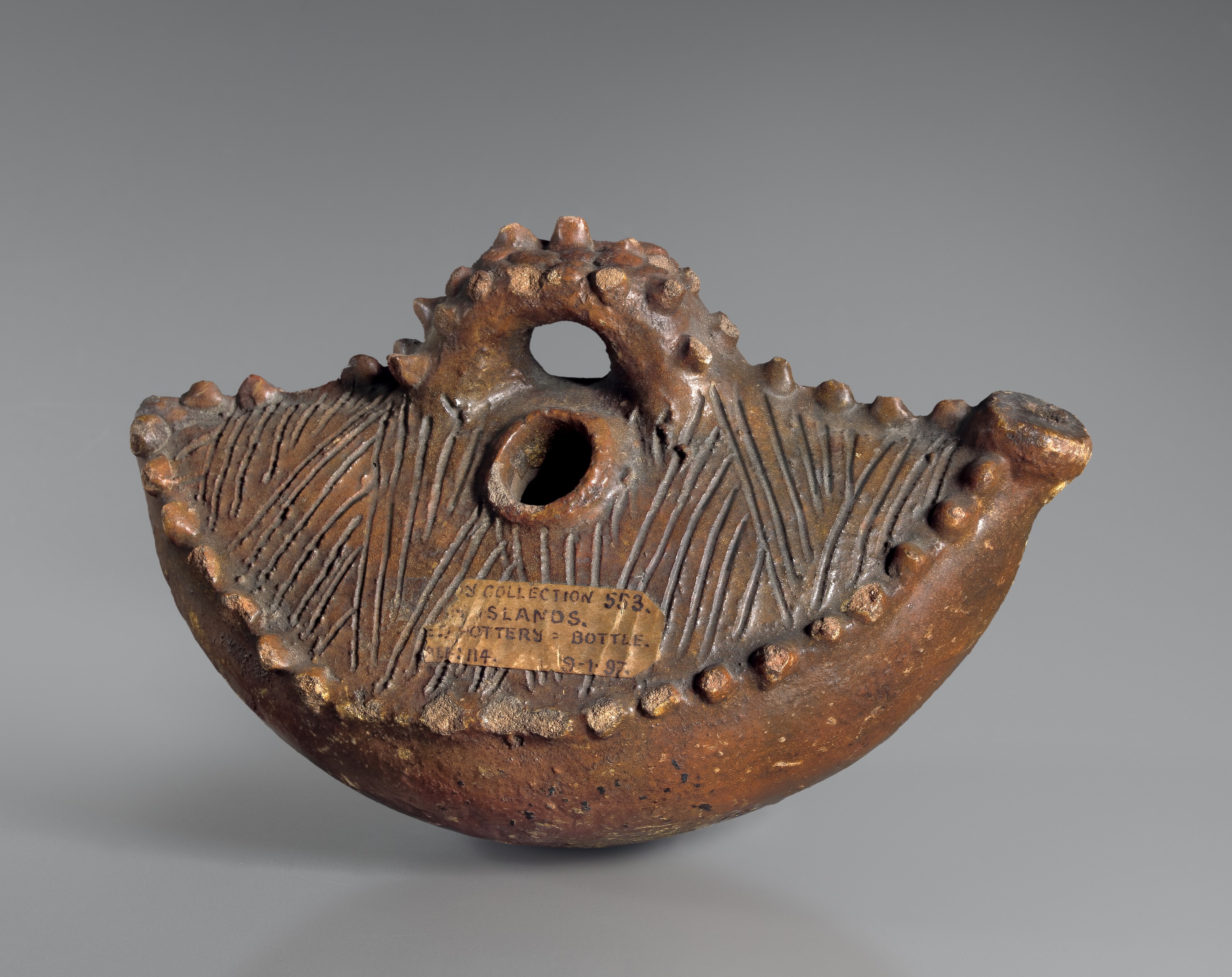 A small master-carver adze-handle, or dellei. The figure carved on the heel is a male ancestral representation wearing a coif shaped like a European hat. The handle which is slotted for a thin stone blade is incised with zig-zag decor representing a crocodile maw and the butt is decorated with a three-dimensional crocodile. Pak Island (?), Admiralty Islands, Bismarck Archipelago, PNG, Melanesia.