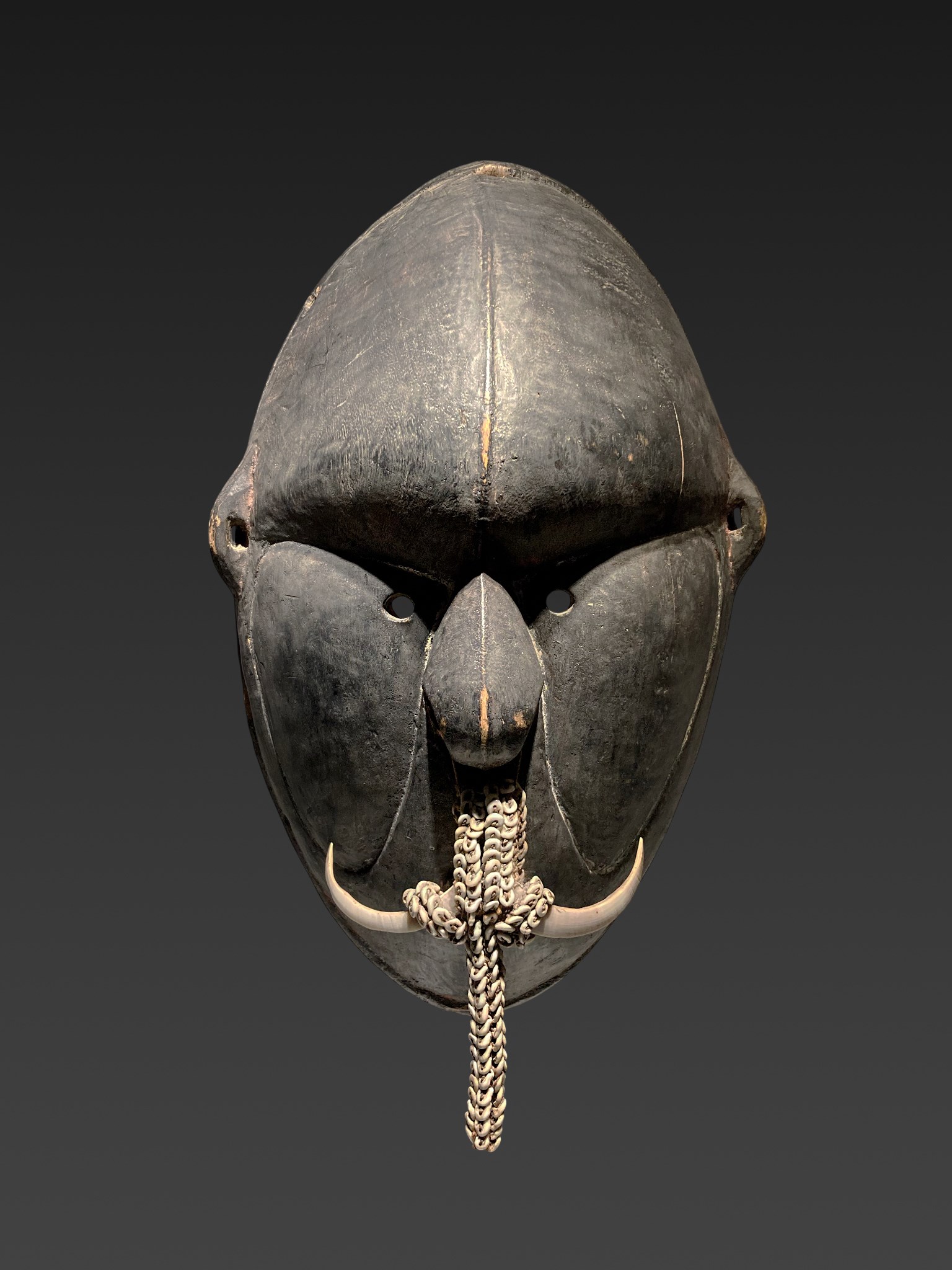 E 250) A wedge shaped standing figure representing an ancestor. The armless body is presented with wide shoulders supported on split legs. The center of the chest offers a large bi-conical hole through the abdomen. The face is well defined in a schematic fashion showing the nose set between the eyes and over a slit mouth. The face and torso show tattoo marks as well as the eyebrows being well indicated. Bering Strait, Alaska. Punuk culture. Circa 600-900 AD. 6,4 cm.