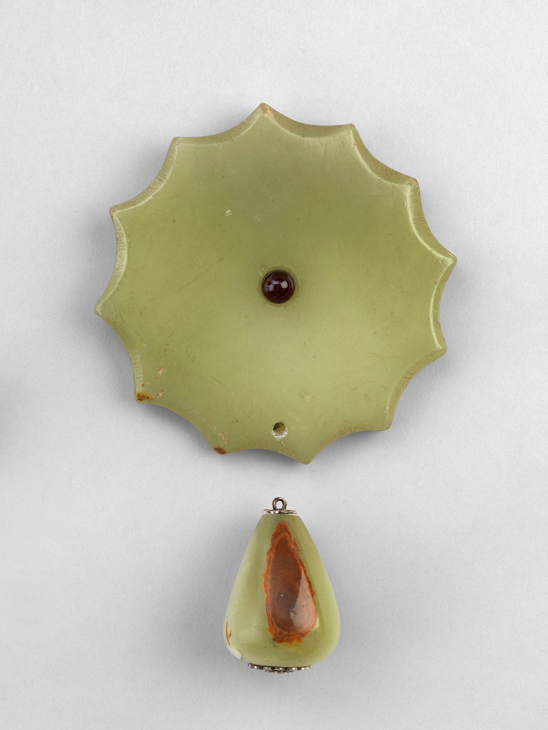 This steel helmet comprises several converging plates linked by rivetted mail. Typically, on most helmets, the bowl is made of a single, continuous piece of metal. However, in this instance, eight triangular steel plates with holes on the sides are held together to make the bowl. A circular disc at the top holds all the plates together. This is concealed with a fluted bud-shaped finial. Fitted at the front with a rectangular staple is a sliding crescent shaped faceguard.[1] Composite helmets like this would have been easier to manufacture than the single metal bowl type helmet. However, they would have been less efficient in protecting the wearer. The open nature of the helmet would have allowed for ventilation and made it lighter, which would have been helpful in hot weather. It is likely that this would have had ear-guards on the sides, which are now lost.