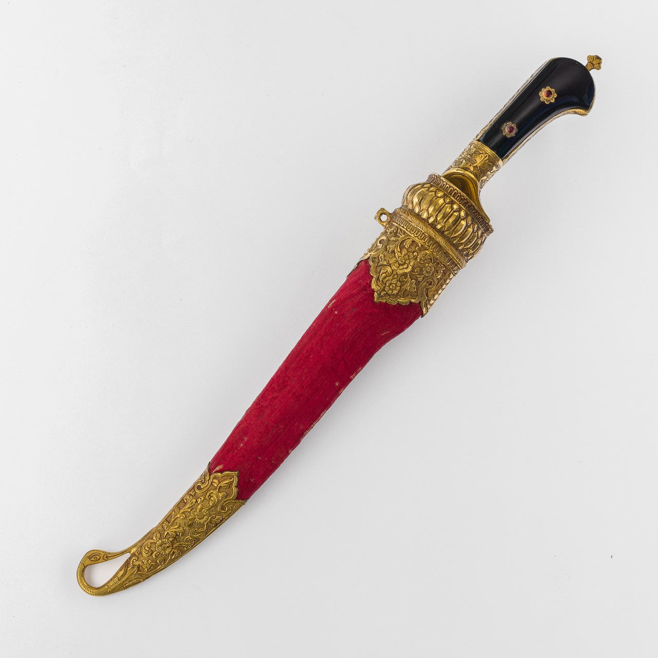 Of conventional oblong form with rounded ends, this pen box (qalamdan) is formed from sheet brass. The lid has been engraved with three roundels, filled with floral interlace sprays, which have been inlaid with silver and gold details at the leaves. Three lines of floriated kufic run across the top of the box. The sides are decorated by a continuous band of elegant engraved roundels, each inlaid with silver inscription. The underside of the box is ornamented with a simple ropework border and six charming etched fish, a common motif in metalwork of the Islamic world. Similar examples are found in the David Collection, Copenhagen (accession no. 6/1997), the Victoria & Albert Museum, London (accession no. M.712-1910), and the British Museum (accession no. 1891,0623.5).