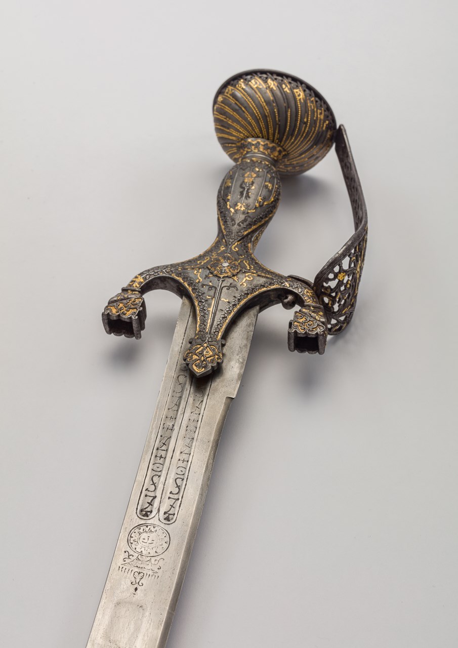A fine Mughal sword known as a Sosun Pattah, meaning 'lily leaf' in Urdu. This name is used for two different swords: one, known as the Rajput form, has a wide blade with a concave segment taken from the tip, and is mounted with a basket hilt (see, for example, a Gujurati Sosun Pattah in the Royal Armouries, Leeds (accession no. XXVIS.118)); the other, including this example, is known as the Islamic form. It has a tulwar hilt, sometimes known as the Indo-Muslim hilt, and a recurved blade which broadens at the tip.1 The blade has a thick T-section false edge of 0.8cm wide. It is plain but for a punched 'bite' mark on the short ricasso, a feature which is believed to have been copied from Genoan swords imported to Asia.