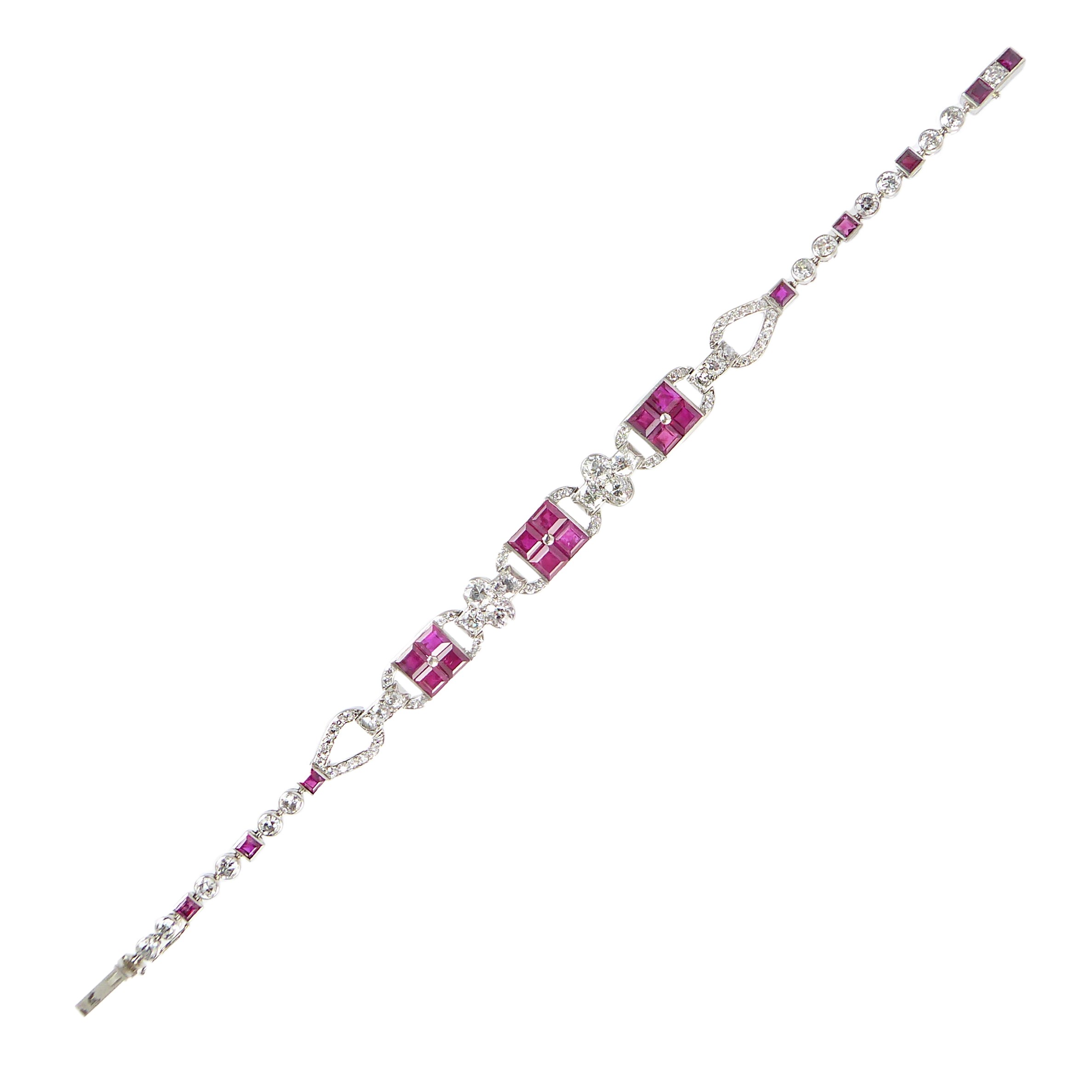 Art Deco ruby and diamond set loop bracelet by Cartier, Paris, centred by three square calibre ruby clusters,