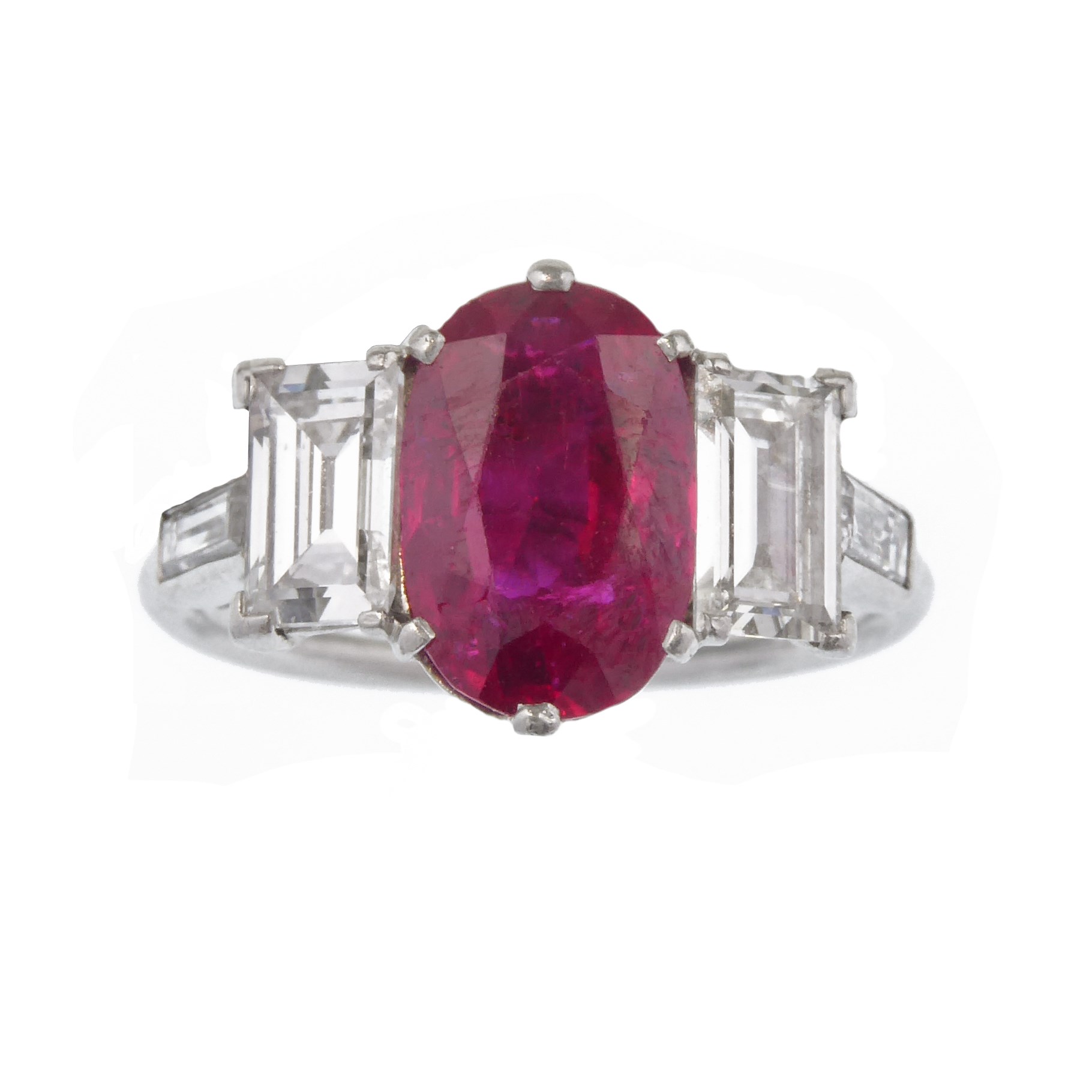 Ruby and diamond three stone ring, French, claw set with an oblong Burma ruby, approximately 1.50ct, between rectangular step cut diamonds approximately 0.70cts in all