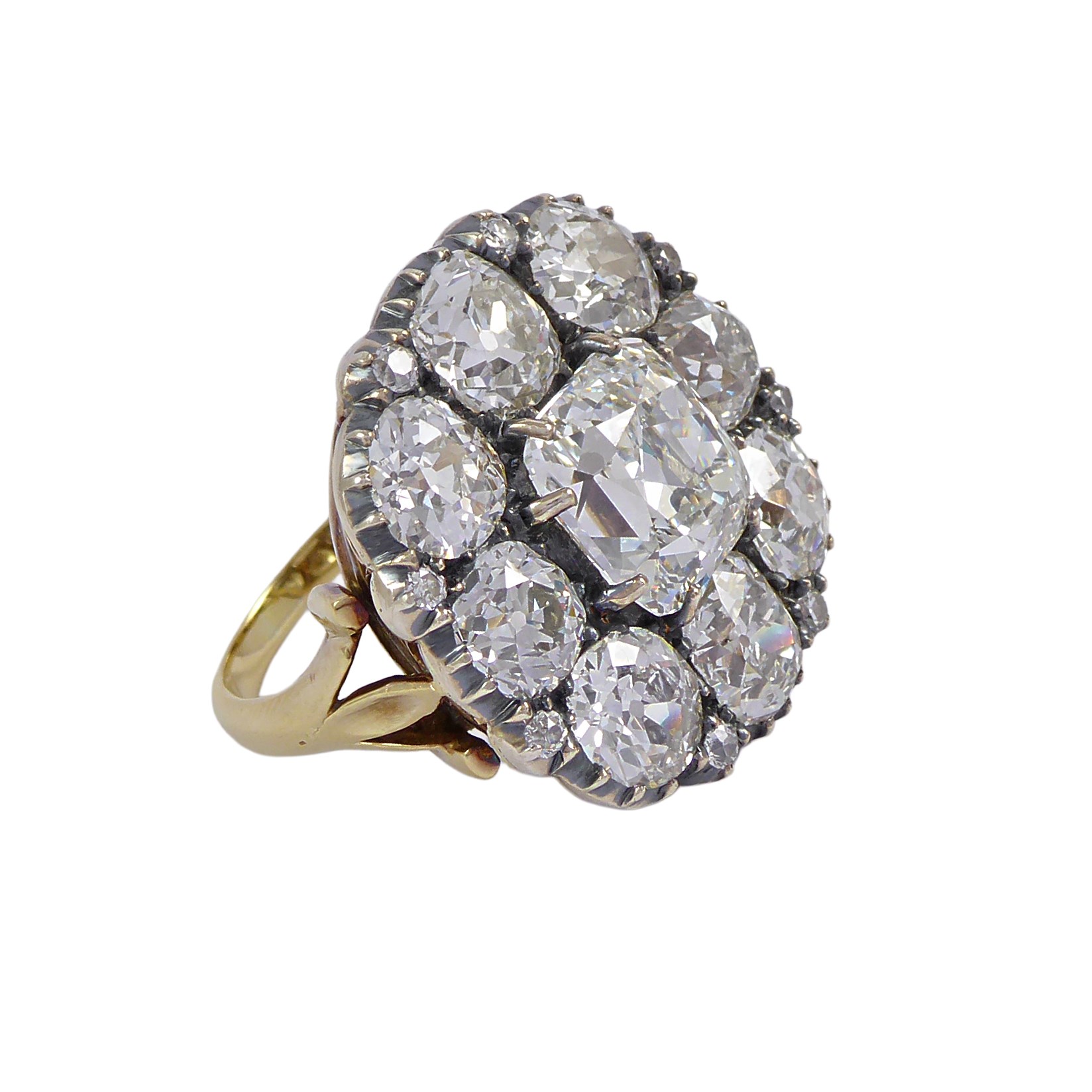19th century cushion cut diamond cluster ring, c.1880, of rounded outline and centred by a principal square-cushion cut diamond of approximately 5.55ct,