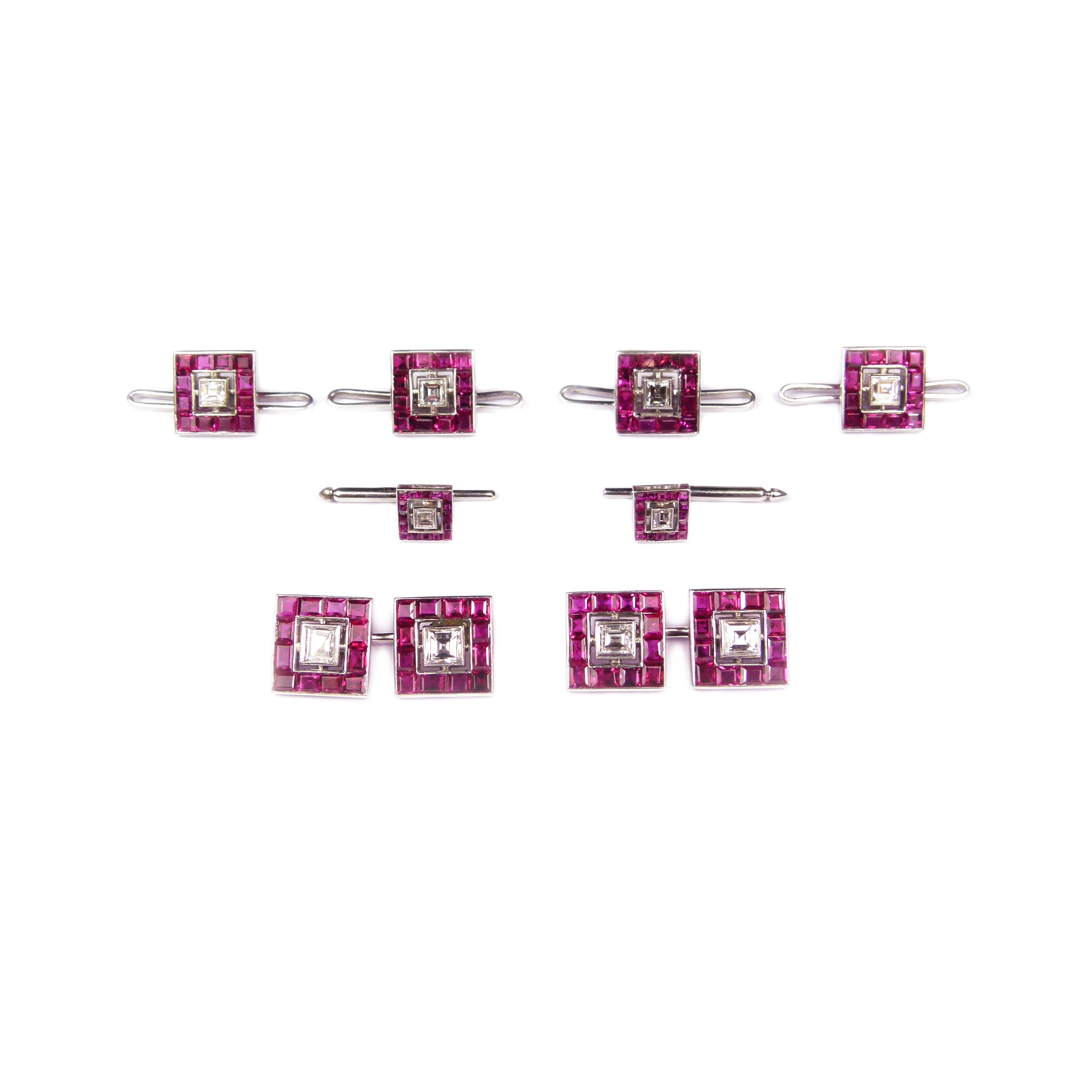 Ruby and diamond square panel gentleman's dress set, comprising a pair of cufflinks, four buttons and two studs