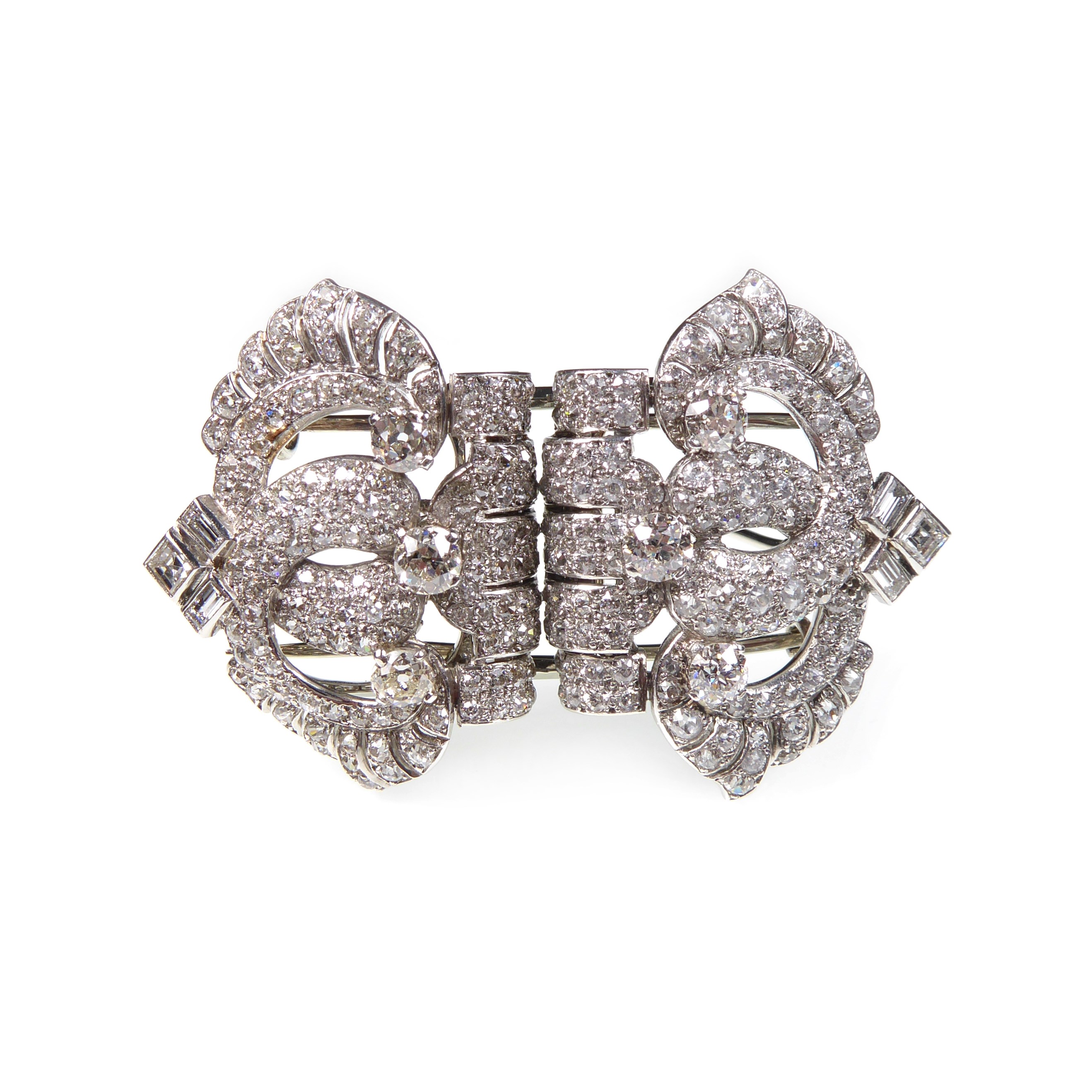 Art Deco diamond double clip brooch by Cartier, London c.1935, stylised buckle form, each side formed of an overlapping double C scroll,