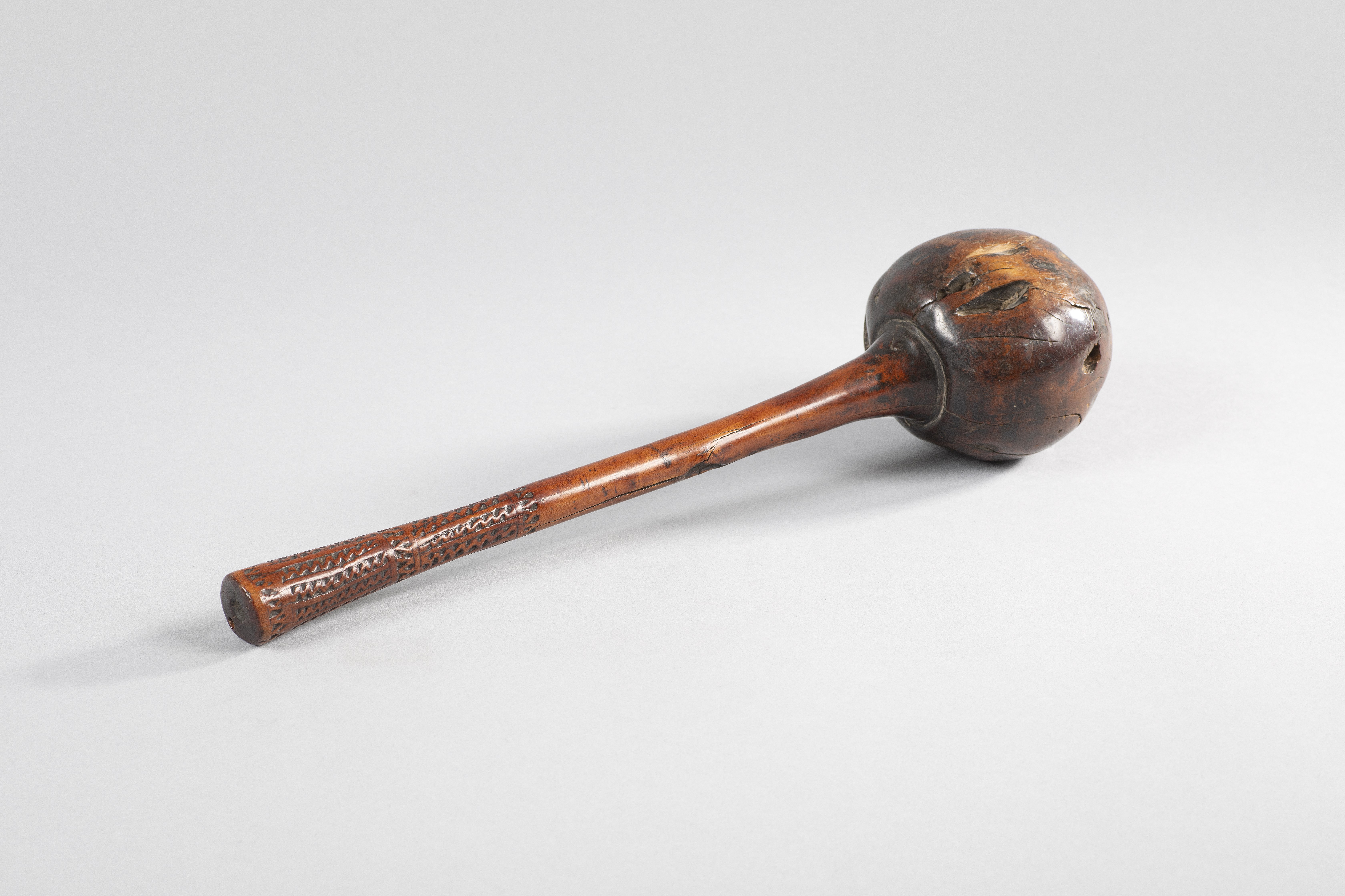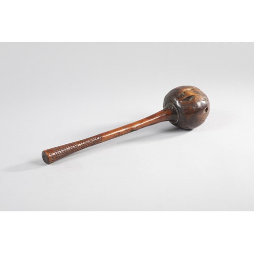 The finial is carved as a superbly elongated human head with slanted eyes and a long trumpet-like nose with fine flared nostrils above a small smiling mouth. The rear of the head is flattened and the suspension loop is carved to represent the scaly head of a mudfish. A large ancestor face with a pointed chin is carved, up-side down, on the rear lower section of the horn. An incised stick figure with spindly arms is carved to the lower front side. The edge of the mouth of the horn is decorated with a scalloped band of carving. This type of horn was most often used during headhunting raids and for battle.