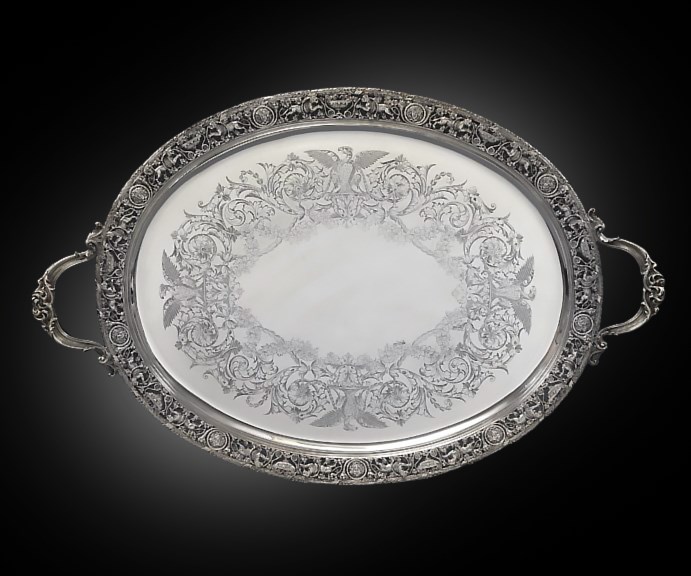 With gadroon border to spreading bases and covers, with detachable fluted finial and detachable cover secured by a pin terminating in a heart motif, the leaf and scroll-embellished spout terminating in an eagle's head.